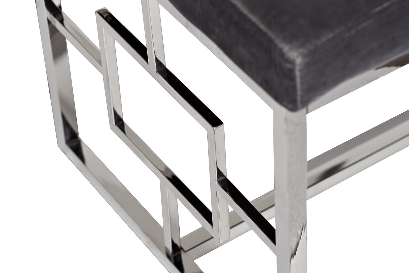 Банкетка из велюра отличаются прочностью и долговечностью. Обивка элегантного светло-серого цвета позволяет вписать ее практически в любой интерьер. Изящество и простота конструкции из полированной стали делает банкетку уместным и надежным предметом меблировки как для дома, так и для офисных помещений.