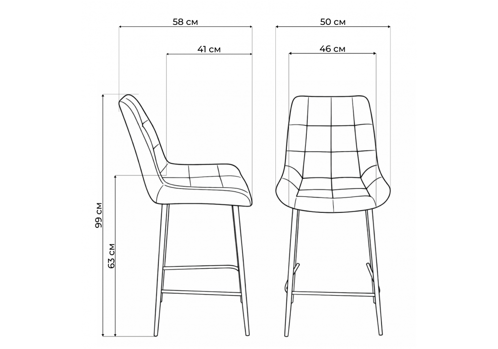 Материал каркаса - металл; Материал сиденья - велюр; Материал обивки - велюр; Цвет ножек - белый; Ширина - 50; Глубина - 58; Высота - 99; Ширина сиденья - 46; Глубина сиденья - 41; Высота сиденья - 63;