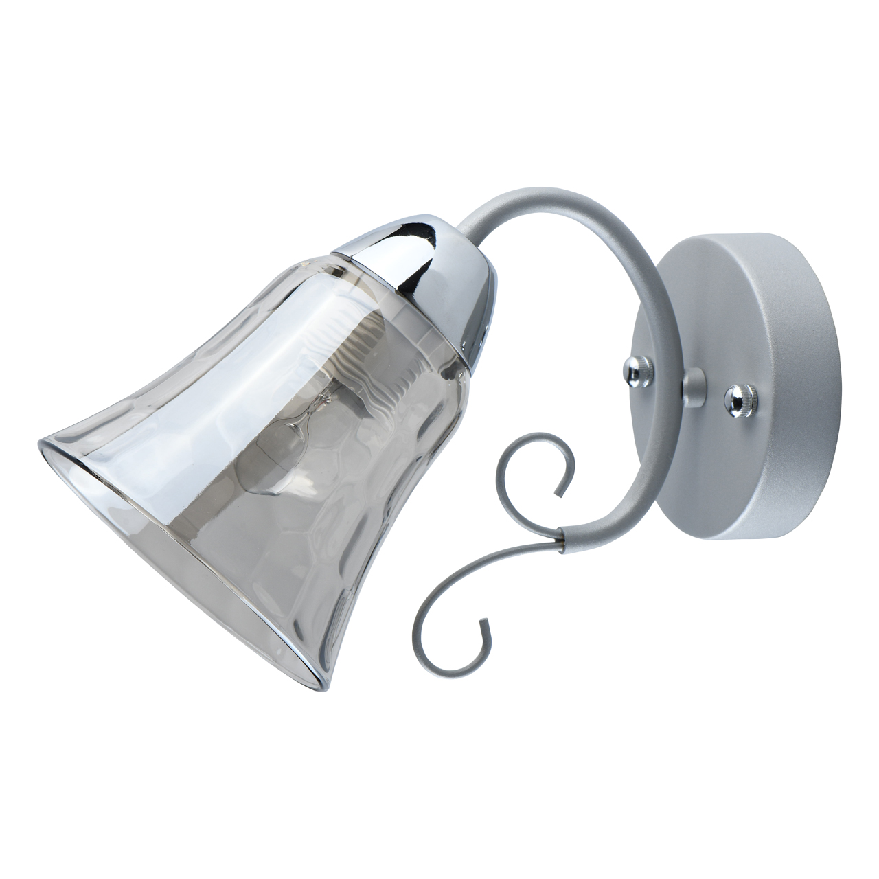 Металлическое основание бра обработано по технологии порошкового окрашивания в серебряный цвет. Отдельные элементы основания гальванизированы в цвет хрома. Рельефный стеклянный плафон отлит в сложную форму и гальванизирован в дымчатый цвет.