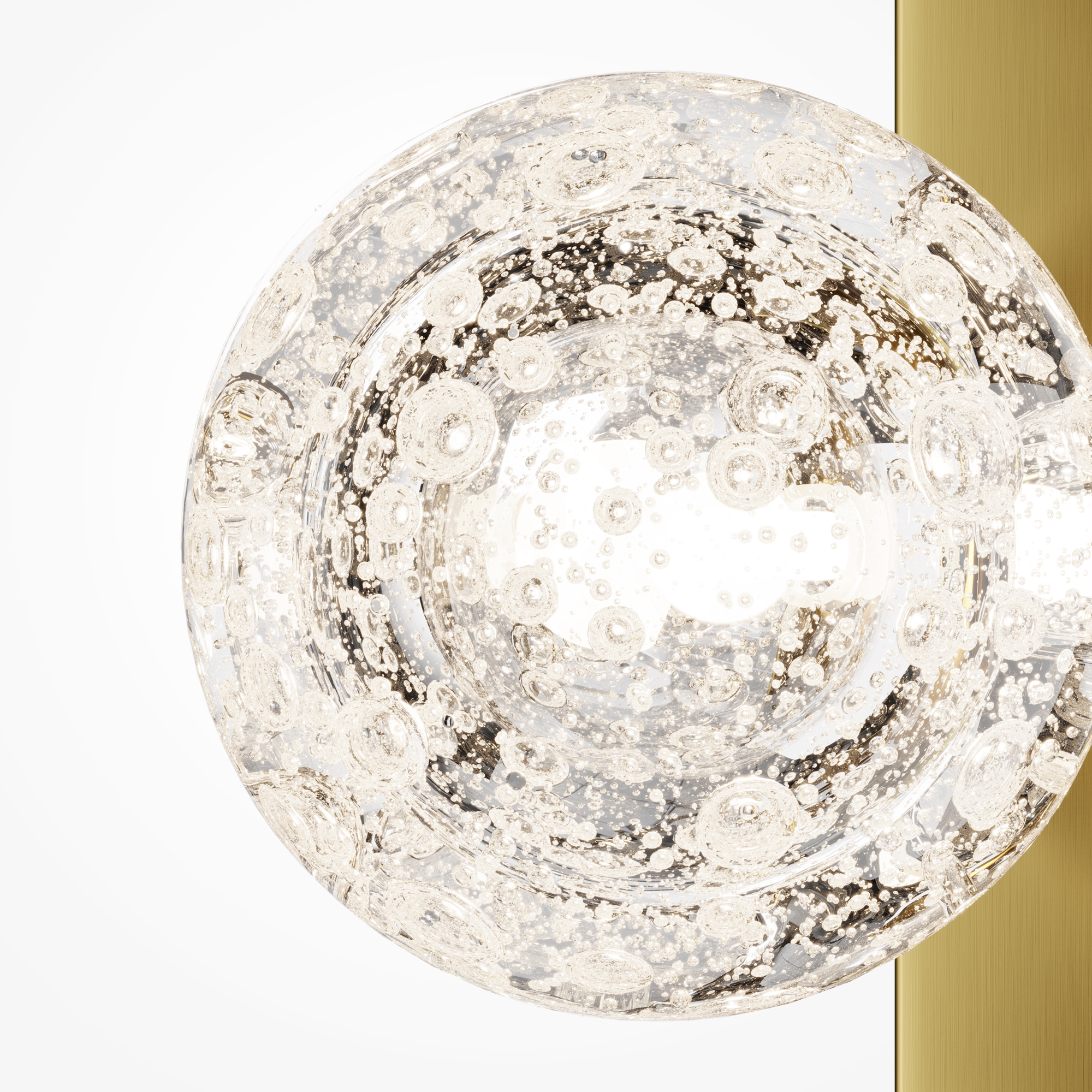 Плафон выполнен из стекла ручной работы с уникальными выдувными пузырьками. Арматура выполнена из алюминия в цвете сатинированной латуни. Сменный источник света с цоколем G9. Каждый светильник уникален благодаря индивидуальной технике ручного выдувания стекла. Обеспечивает мягкое рассеянное освещение, идеально подчеркивающее текстуру стекла. Предназначен для создания изысканных акцентов в интерьерах классического стиля и ар-деко. Рекомендуется для гостиных, спален, коридоров и ресторанов.