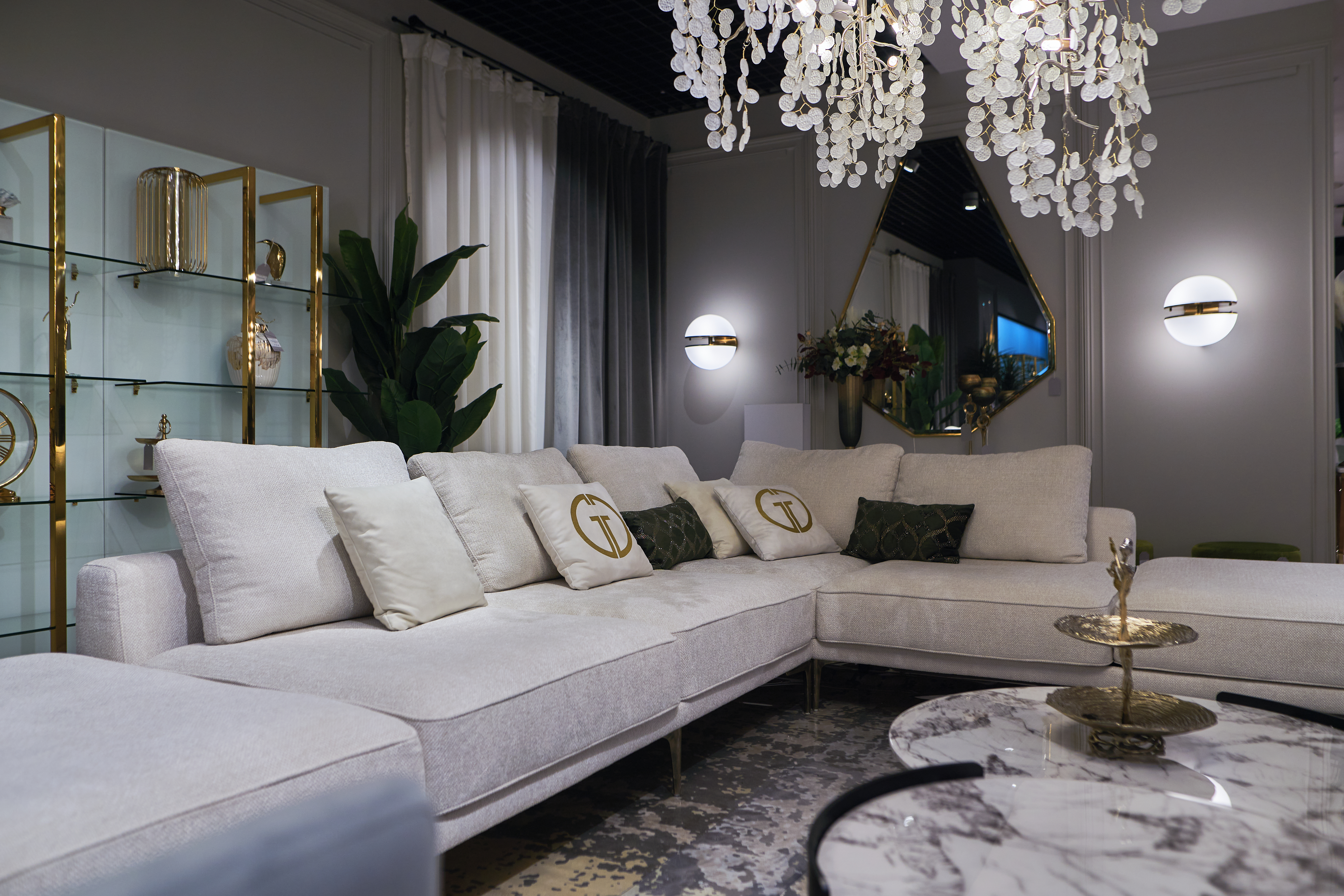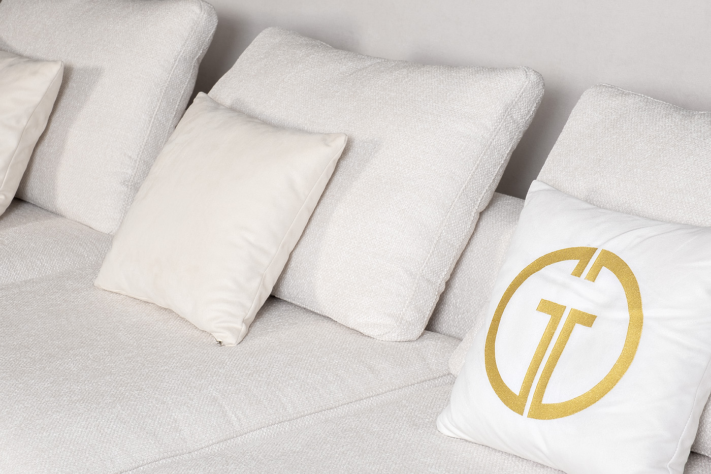 Комплект мебели №51 модульный Диван Тесоро(Tesoro) (левый угол). В состав комплекта входит: модуль прямой DO+P-1шт, модуль угловой правый DR+P- 1шт. Комплект выполнен в ткани из коллекции Garda Decor- шенилл Mobi-Ecru. В состав комплекта входят декоративные подушки: 45*45см в ткани Атмосфера(Atmosphera)010-2шт, 45*45см в ткани Атмосфера(Atmosphera)000-2шт с вышивкой эмблема в цвет золото. Металлические опоры 18см, цвет бронза. Габариты комплекта: ширина- 2900мм, глубина-3800мм, высота- 900мм. Глубина сиденья- 750мм, высота посадочного места- 440мм.