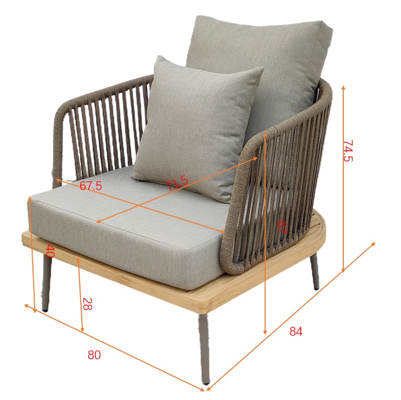 Уличное кресло изготовлено из устойчивых к погодным условиям материалов. Cъемные подушки выполнены из специальной уличной ткани с водоотталкивающими свойствами OLEFIN тайваньского производства. Светлая ткань не будет сильно нагреваться на солнце и выцветать. Каркас из алюминия декорирован в цвет дерева, подлокотники и спинка оплетены декоративным шнуром. В комплект входит подушка сиденья 12см, подушка спинки и декоративная квадратная подушка. Габариты сиденья: ширина 67,5см, глубина 71,5см, высота от пола 40 см, высота подлокотников от сиденья 27см. Сочетается с уличными диванами 129KN-03042, 129KN-03046, 129KN-03047 и кофейными столиками 129KN-01430, 129KN-00620.