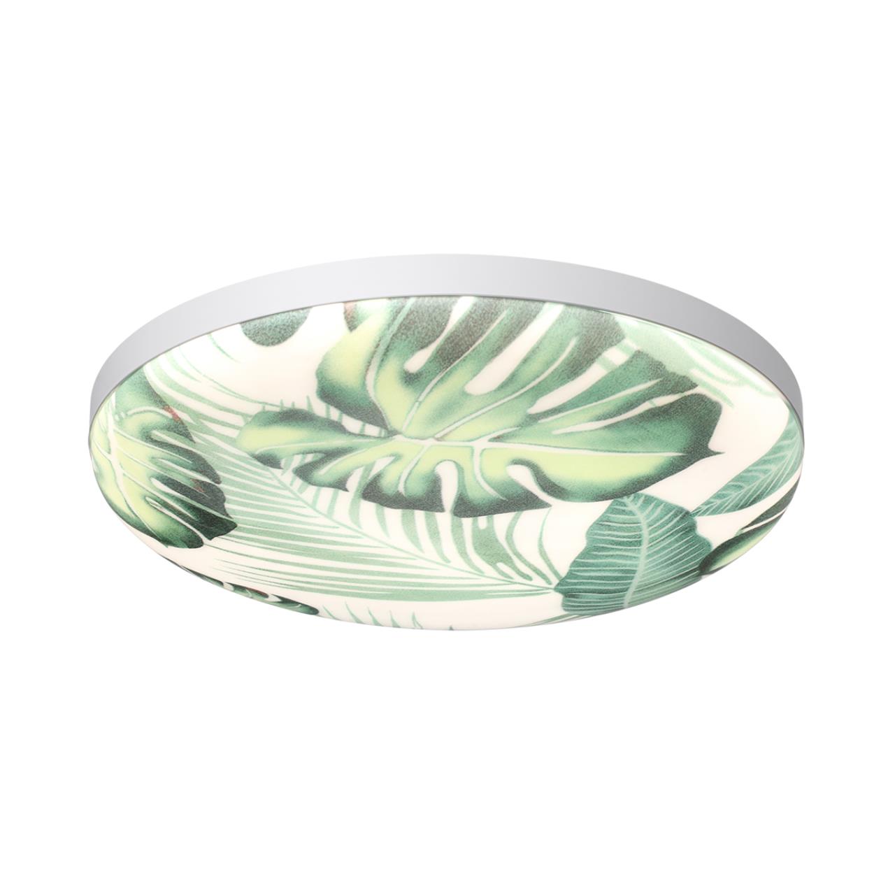 Изумительная модель 7748/DL от Итальянского производителя SONEX относится к коллекции FLORI . Светильник состоит из металлического основания (базы) и пластикового рассеивателя. Материал рассеивателя - высококачественный пластик марки PMMA 2.0 белого цвета с глянцевой поверхностью, обеспечивающий светильнику равномерное рассеивание и хорошее светопропускание. Форма плафона: круглая, декорирована орнаментом на плафоне с зеленым рисунком тропических листьев и съемным ободом белого цвета. Рисунок на плафоне выполнен методом цифровой печати по технологии прямого нанесения красок на акриловый лист. С целью предотвращения выцветания красок поверх рисунка наносится слой белой краски. После выдувания плафона при высоких температурах красочный рисунок приобретает стойкость и долговечность. Степень защиты IP43 позволяет использовать светильник в определенных зонах влажных помещений. В комплект входит заменяемый LED модуль с линзами, мощностью 48Вт, которая соответствует лампе накаливания 440Вт. А также пульт ДУ, с помощью которого осуществляется плавное изменение цветовой температуры 3000-6000. Данную модель 7748/DL с быстрой доставкой спешите купить в магазине 220svet.ru