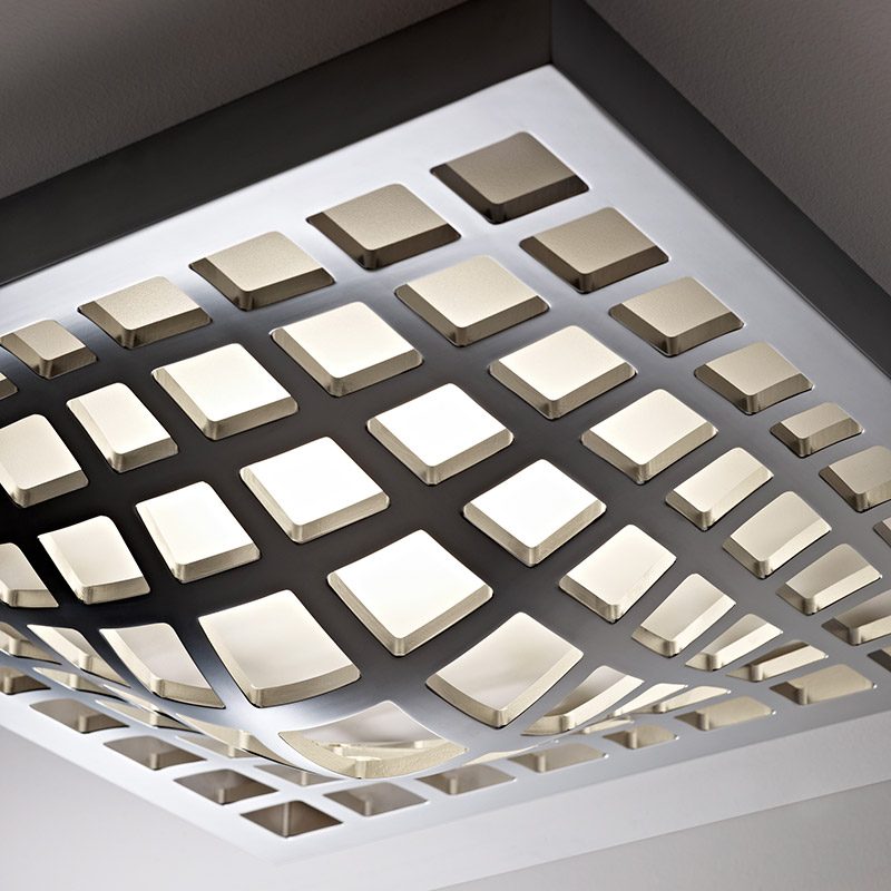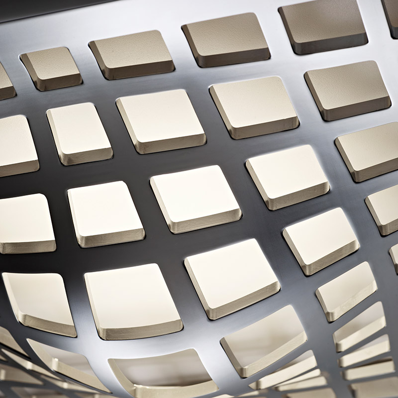 Оригинальный настенно-потолочный светильник KWARK выполнен в виде алюминиевой решетчатой полусферы покрытой блестящим хромом. Исключительность данной модели проявляется в способности создавать иллюзорный эффект объёмной фигуры за счет отражающей способности задней панели светильника.