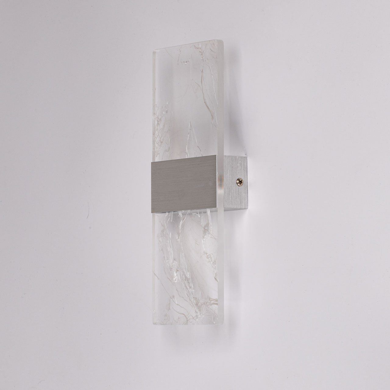 Металлическое основание настенного бра окрашено в цвет серебра. Основа плафона выполнена из сплава алюминия с цинком, обработана по технологии брашинг и оксидирована. Настенное бра декорировано полупрозрачным акриловым плафоном с декоративными белыми разводами.