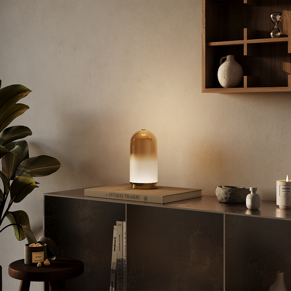 Настольные светильники серии Fable в двух цветовых решениях. Арматура: металл цвета сатинированной латуни или черный. Плафоны: стекло с градиентным окрашиванием (янтарный или дымчато-серый цвета). Встроенный LED-источник мощностью 8W, световой поток 1000 Lm, цветовая температура 3000K. Функция диммирования. Угол рассеивания 120°, индекс цветопередачи CRI 80. Высота 295 мм, диаметр плафона 145 мм. Степень защиты IP20. Для создания локального освещения в интерьерах различных стилей.