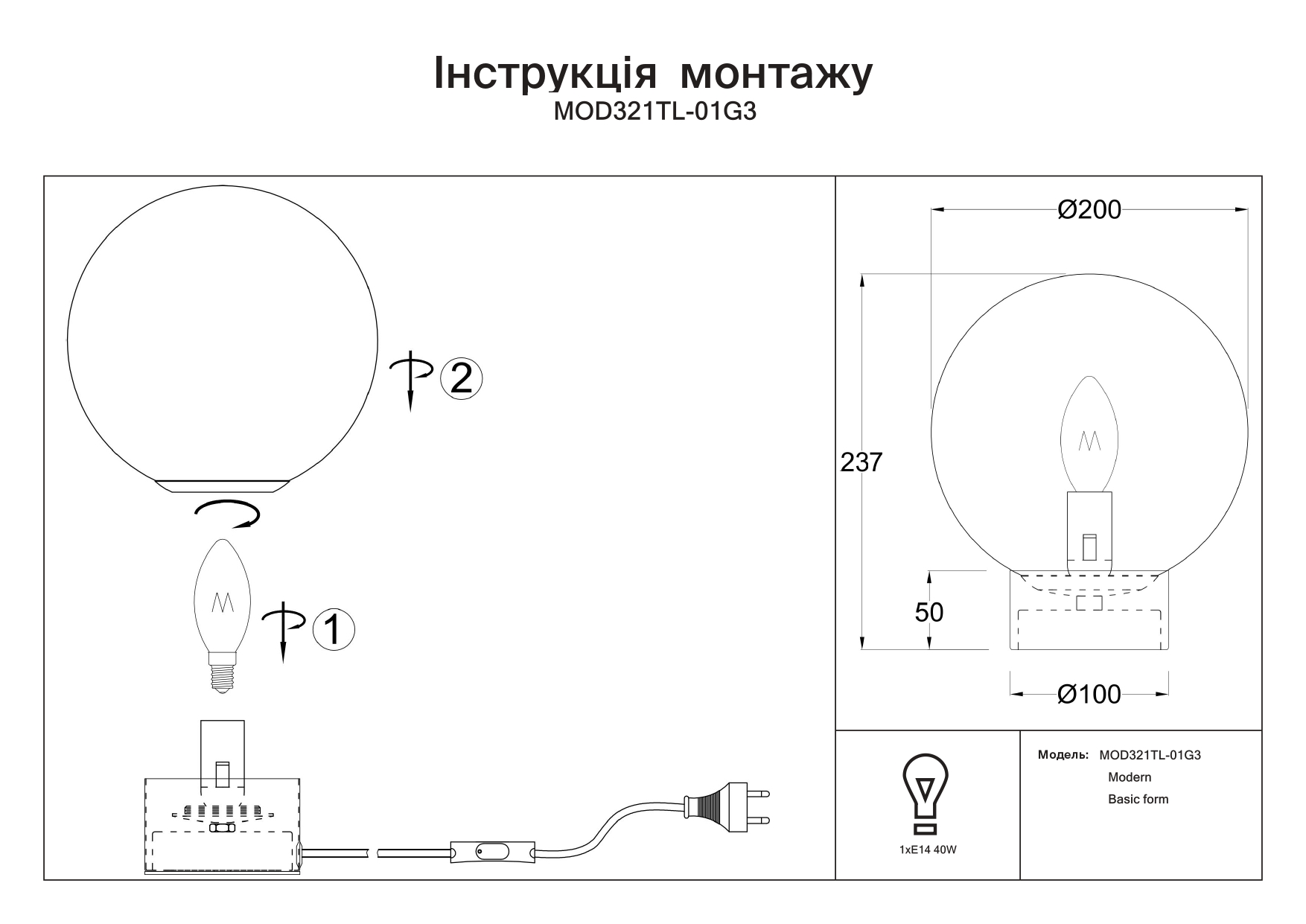 - Мощность лампы: 40 W