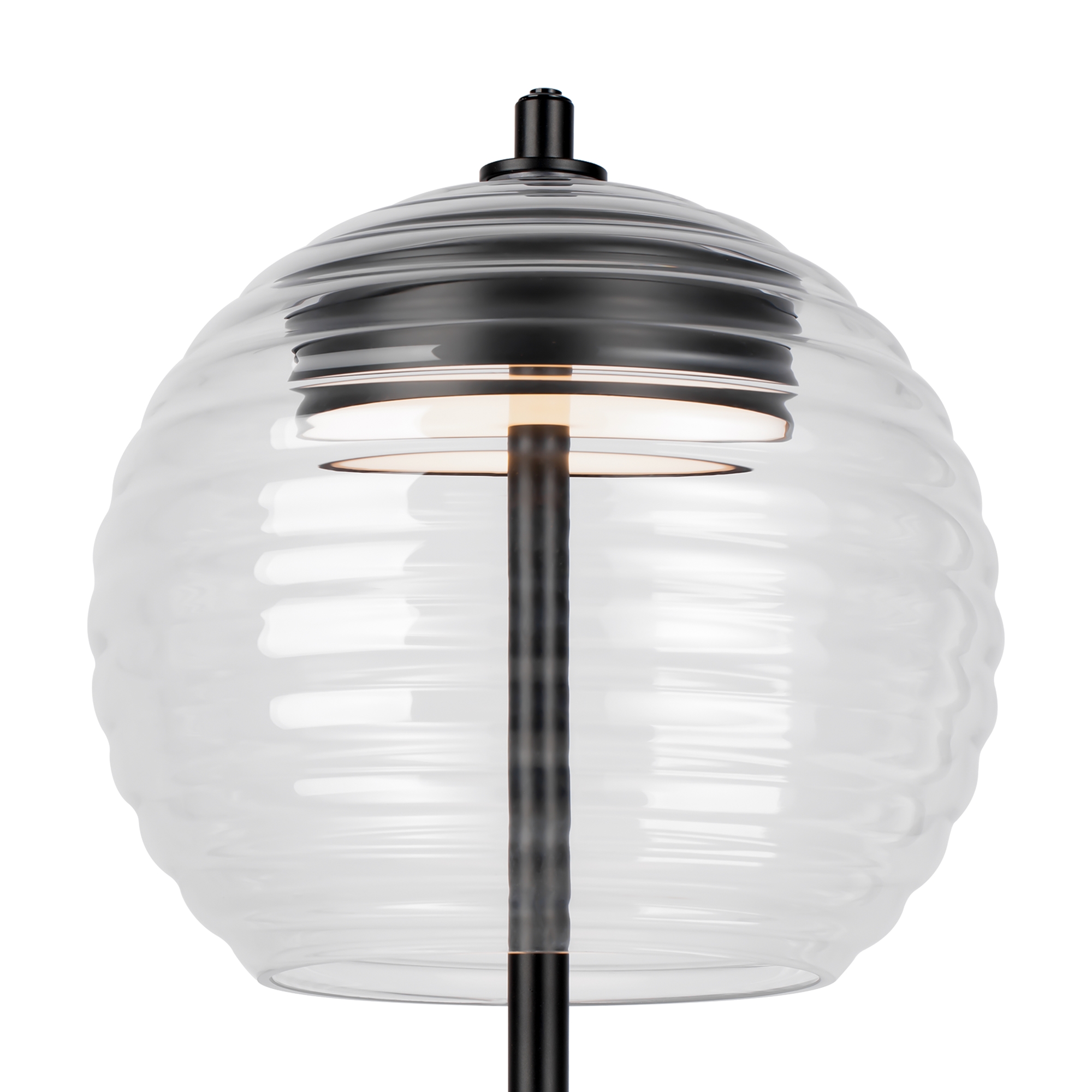 Арматура из металла, оттенки – никель, латунь, матовый черный. Плафон-сфера из прозрачного стекла с рельефным рисунком. Источник света установлен в металлическом корпусе сверху. Регулируемая высо