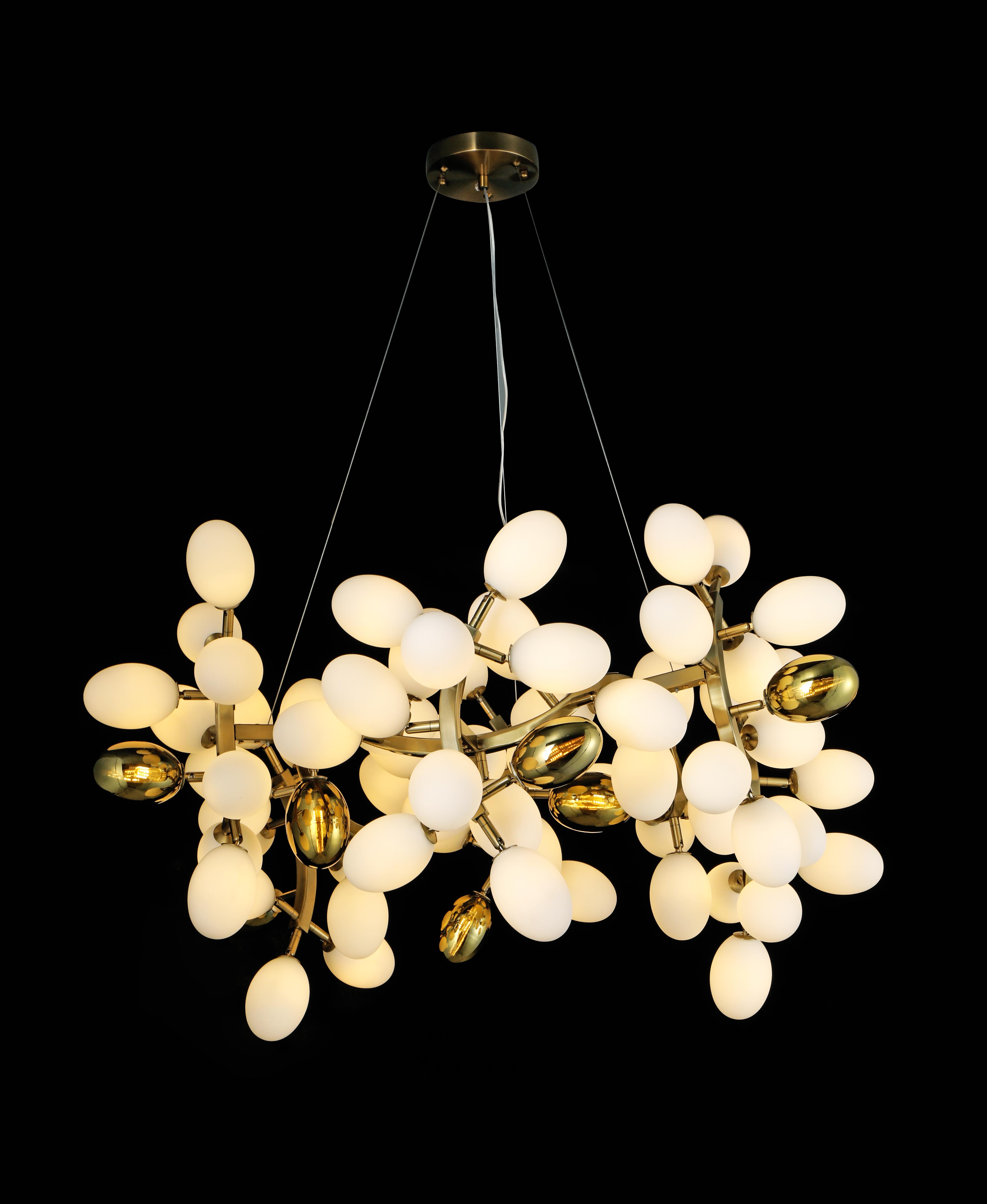 Люстры отличаются элегантным сочетанием матово-белого и золотистого цветов, что добавляет помещению утончённости и роскоши. Металлическая арматура обеспечивает долговечность, а стеклянные плафоны создают мягкий, равномерный свет, идеально подходящий для освещения площадью от 20 до 30 кв.м. Эти модели оснащены 74 светодиодными лампочками с цоколем G4, что гарантирует энергоэффективность и долгий срок службы. Высота люстр составляет 1000 мм, а диаметр 800 мм.