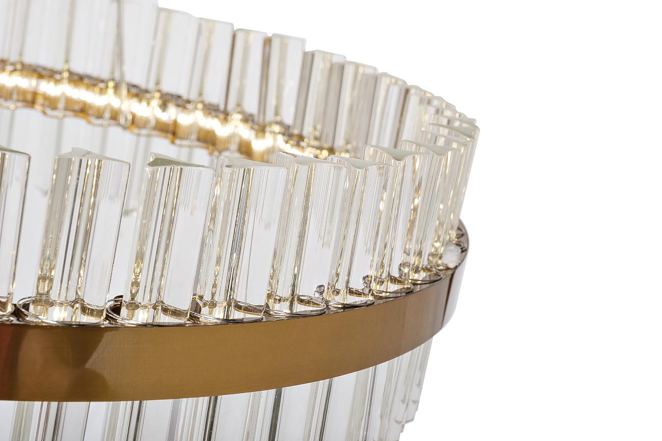 При создании данного современного потолочного светильника дизайнеры отказались от пышного и вычурного декора, получив стильное решение. По диаметру более полуметра расположены стеклянные палочки, в разрезе представляющие собой треугольную звезду. Объединены стеклянные фигуры металлической опорой из нержавеющей стали. Стеклянная люстра с LED-технологией дает приятное теплое освещение. Будучи невысокой, подвесная композиция смотрится изысканно и лаконично, дополняя интерьер современных помещений. Рекомендуемая площадь освещения 15 м2.