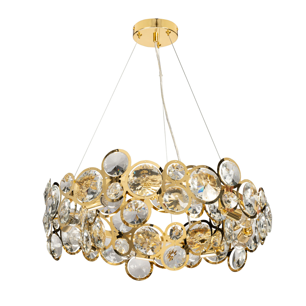 Металлическое основание и плафон подвесной люстры гальванизированы в цвет золота. Металлический плафон выполнен по технологии лазерной резки. Люстра декорирована прозрачным хрусталем круглой формы.
