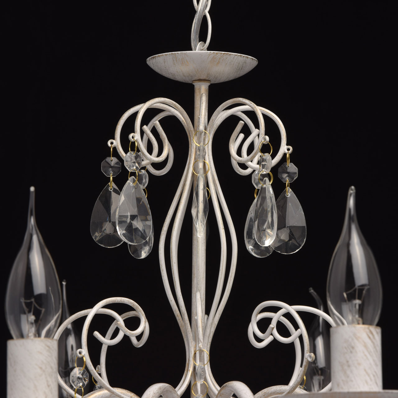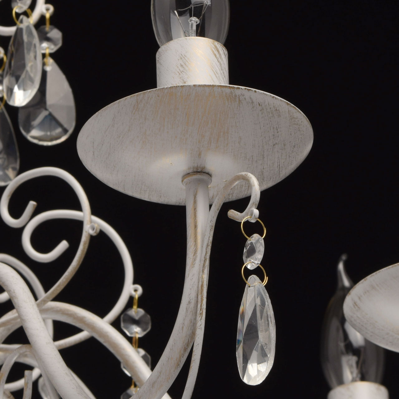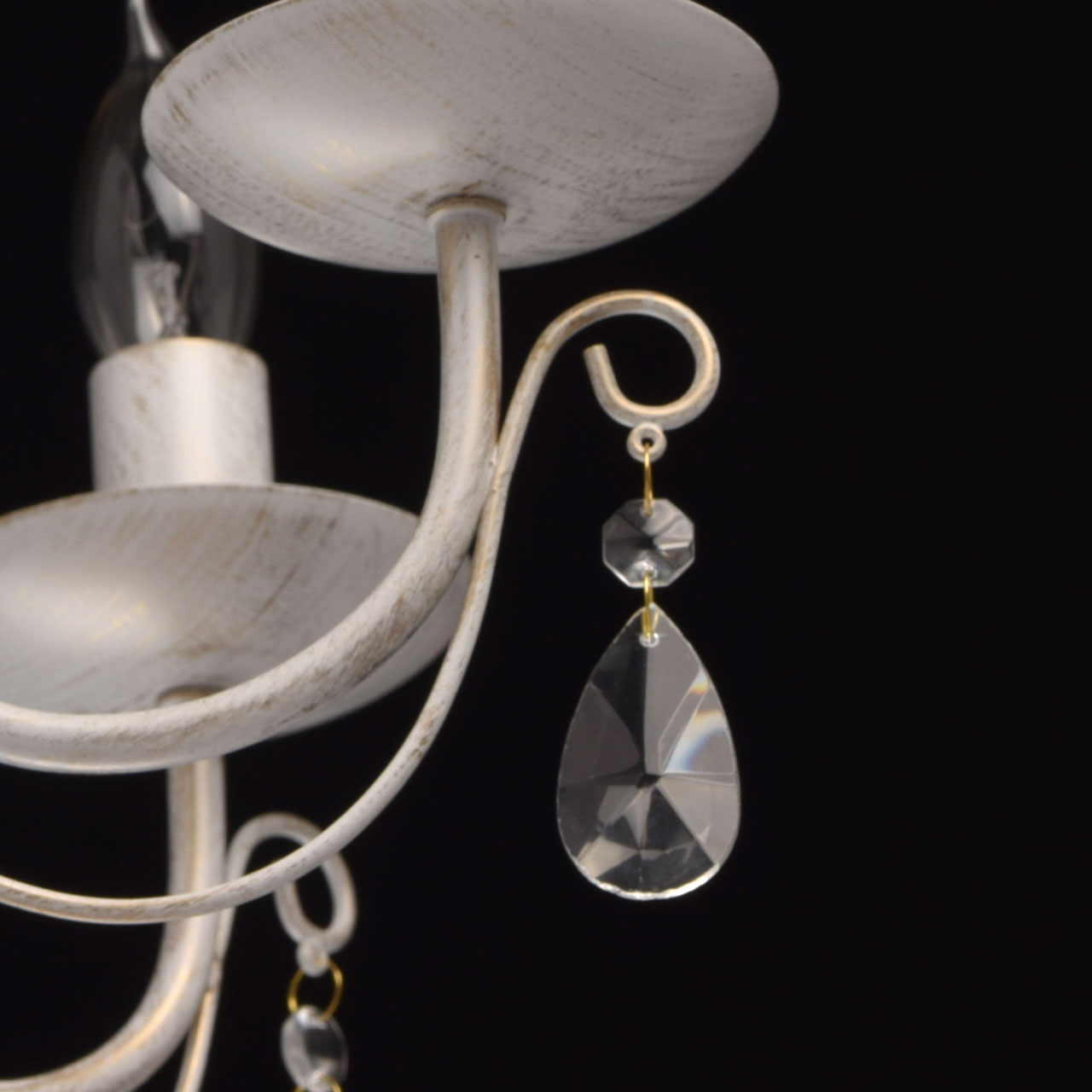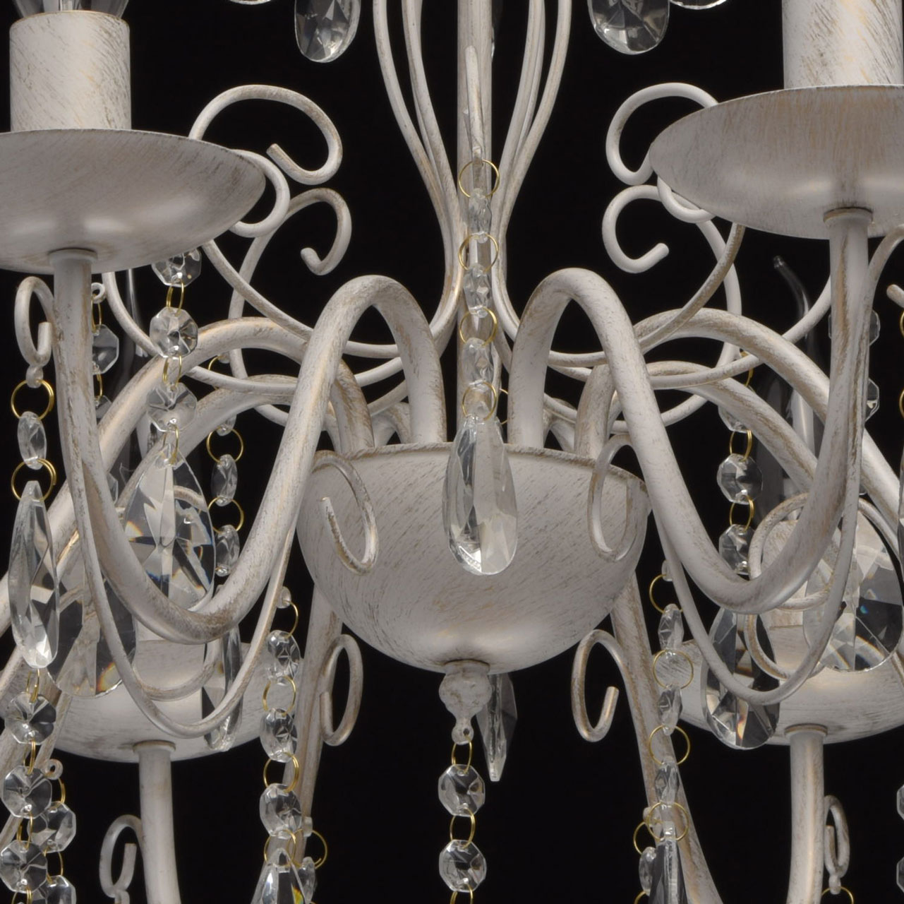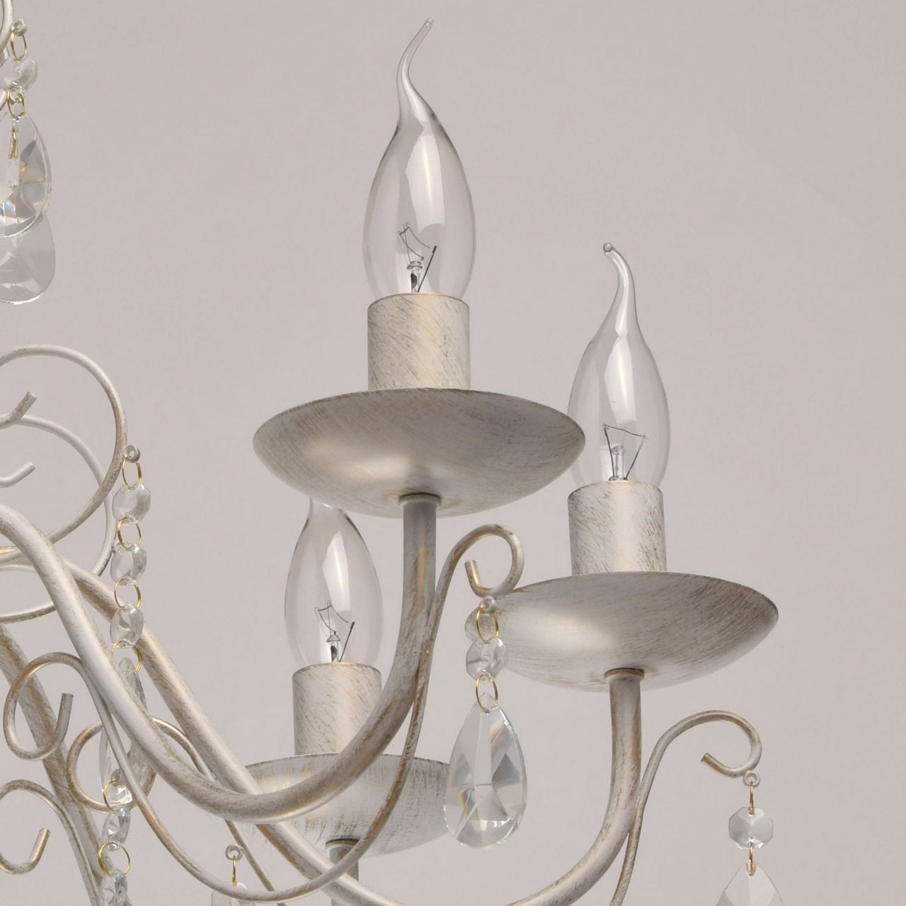 Основание из металла, окрашена по технологии хай-лайт, основной слой белого матового цвета, декоративный слой цвета золота.Декоративные элементы изготовлены из металла по технологии проката на роликовом станке, розетки - технология токарной обработки.Декор: подвески из декоративного прозрачного стекла