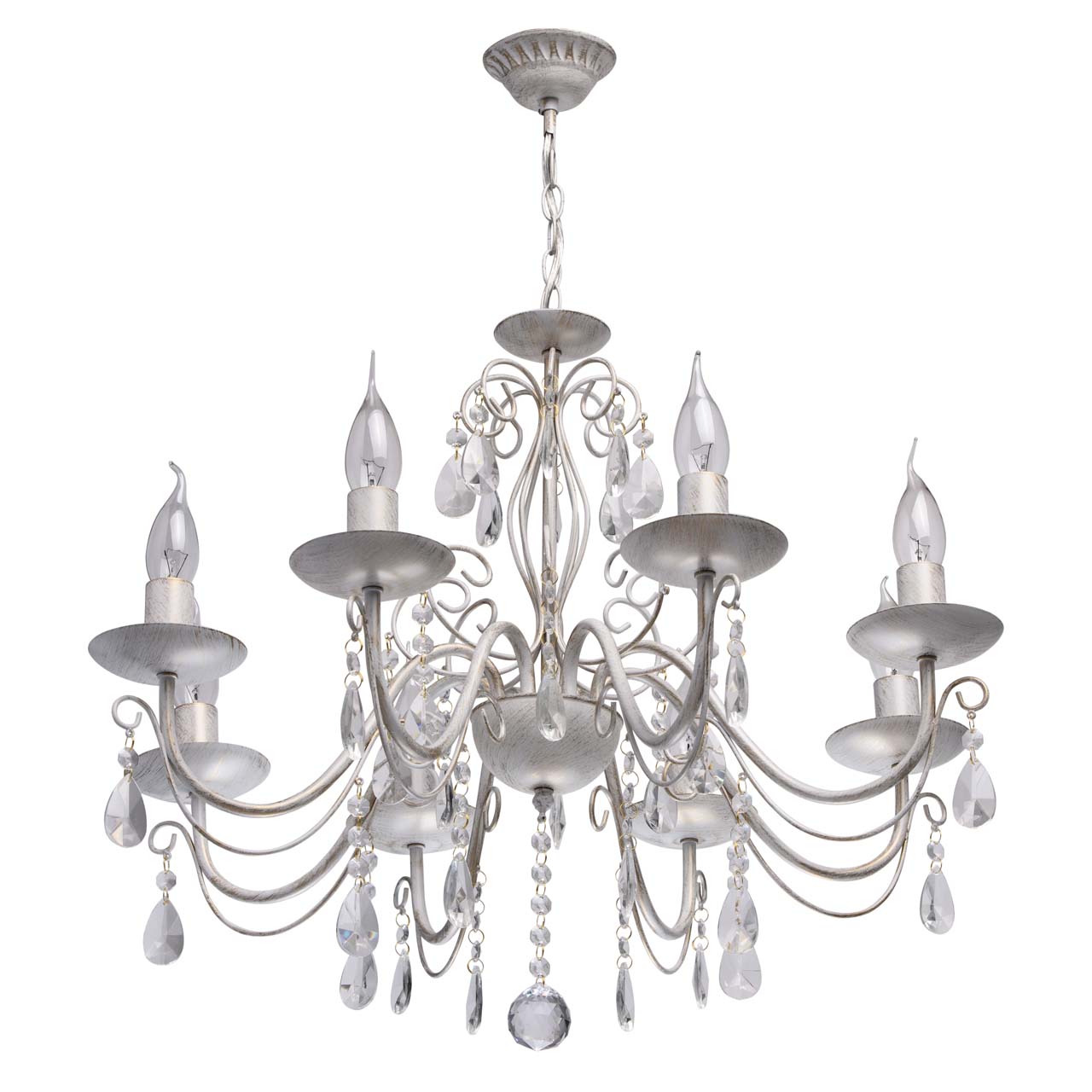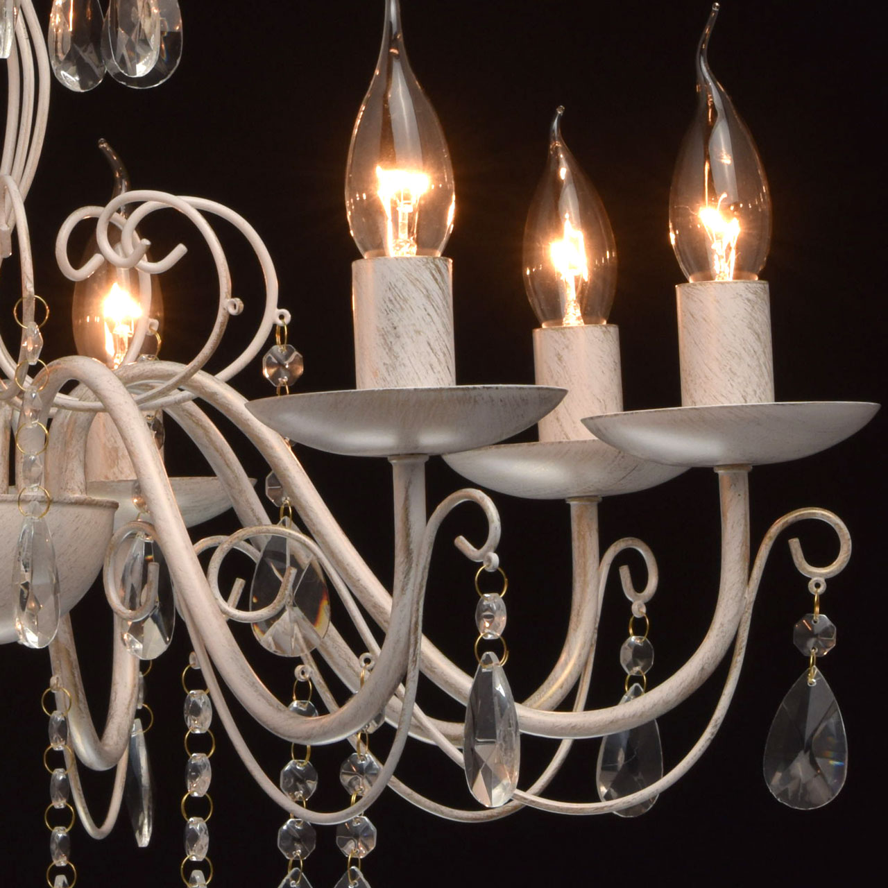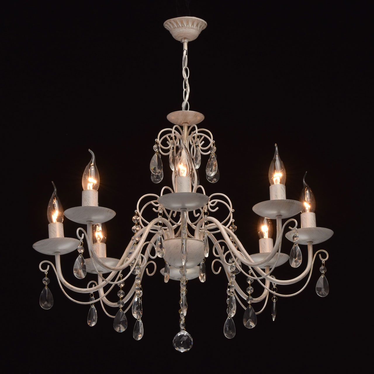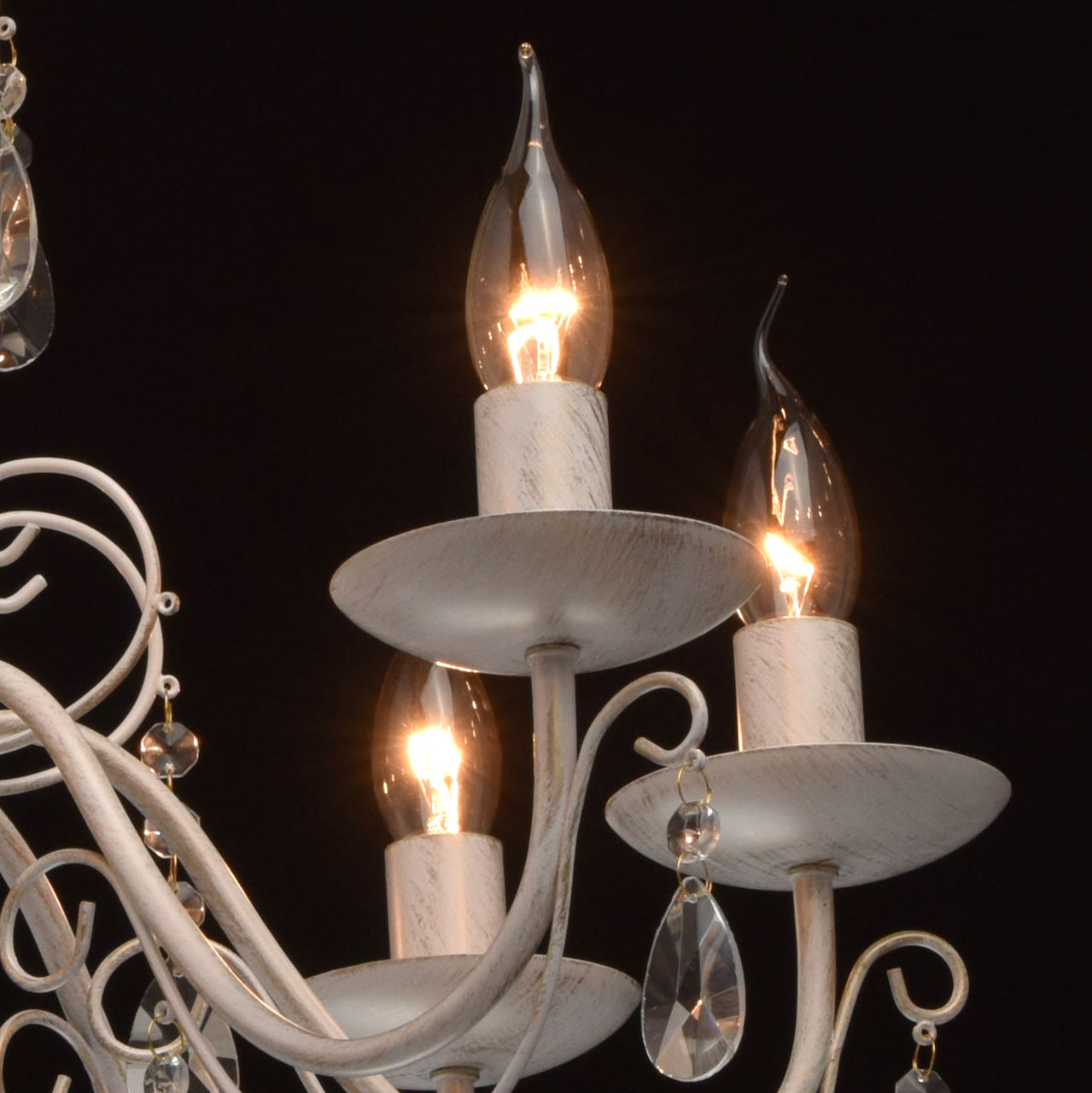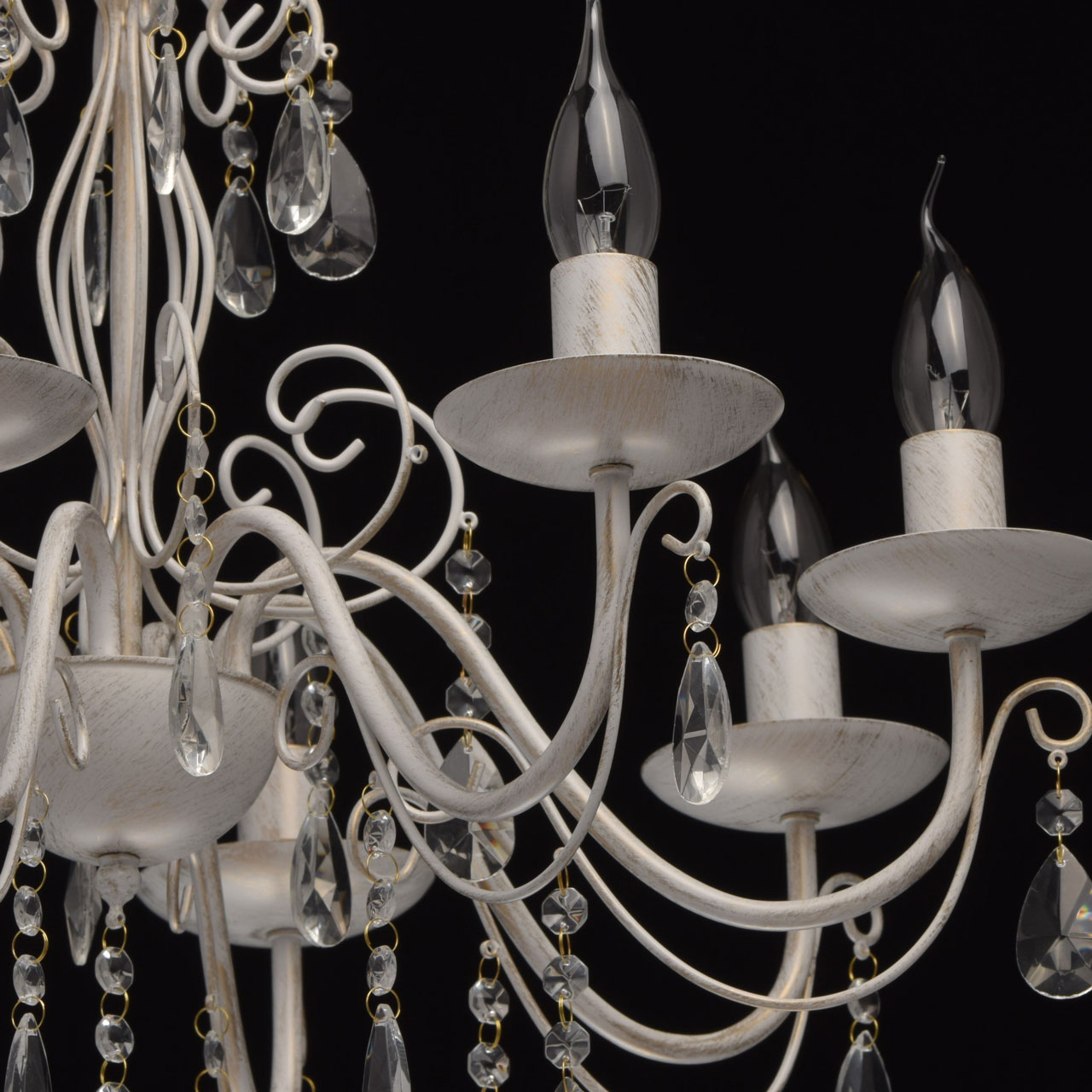 Основание из металла, окрашена по технологии хай-лайт, основной слой белого матового цвета, декоративный слой цвета золота.Декоративные элементы изготовлены из металла по технологии проката на роликовом станке, розетки - технология токарной обработки.Декор: подвески из декоративного прозрачного стекла