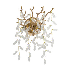 Металлическое основание подвесной люстры окрашено в цвет латуни. Люстра декорирована подвесками из прозрачного декоративного стекла.