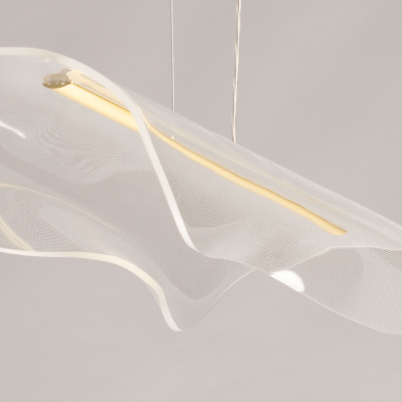 Металлическое основание подвесной люстры гальванизировано в цвет золота. Люстра декорирована прозрачным акрилом оригинальной формы.
