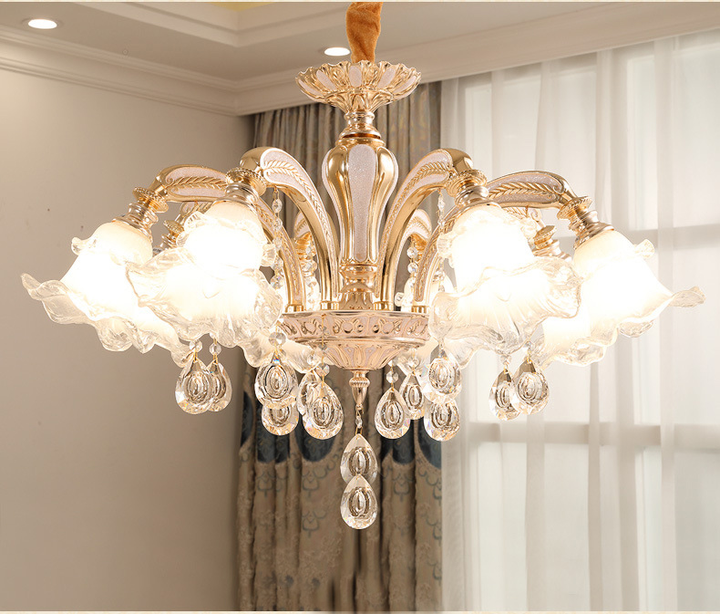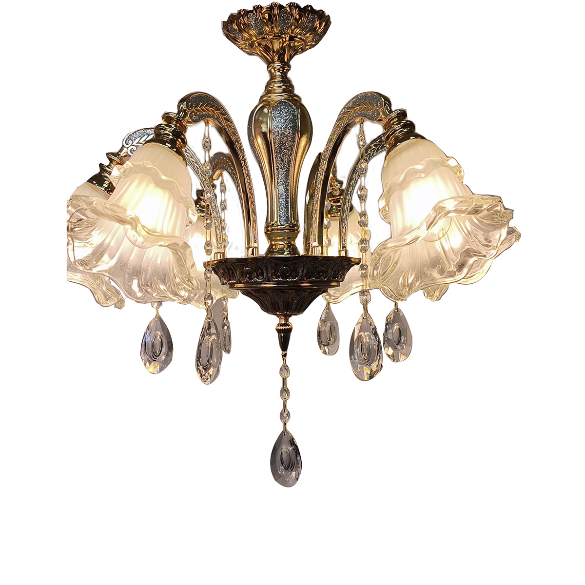 *Конструкция люстры* включает шесть плафонов из матового стекла, которые мягко рассеивают свет, создавая уютную атмосферу. Металлическая арматура с золотистым покрытием придает изделию роскошный вид и обеспечивает долговечность конструкции.