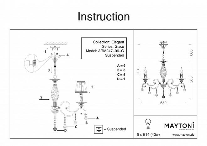 Подвесная люстра Maytoni Grace ARM247-06-G, имеющая 1 класс защиты, станет не только источником света, но и стильным акцентом в вашем интерьере.