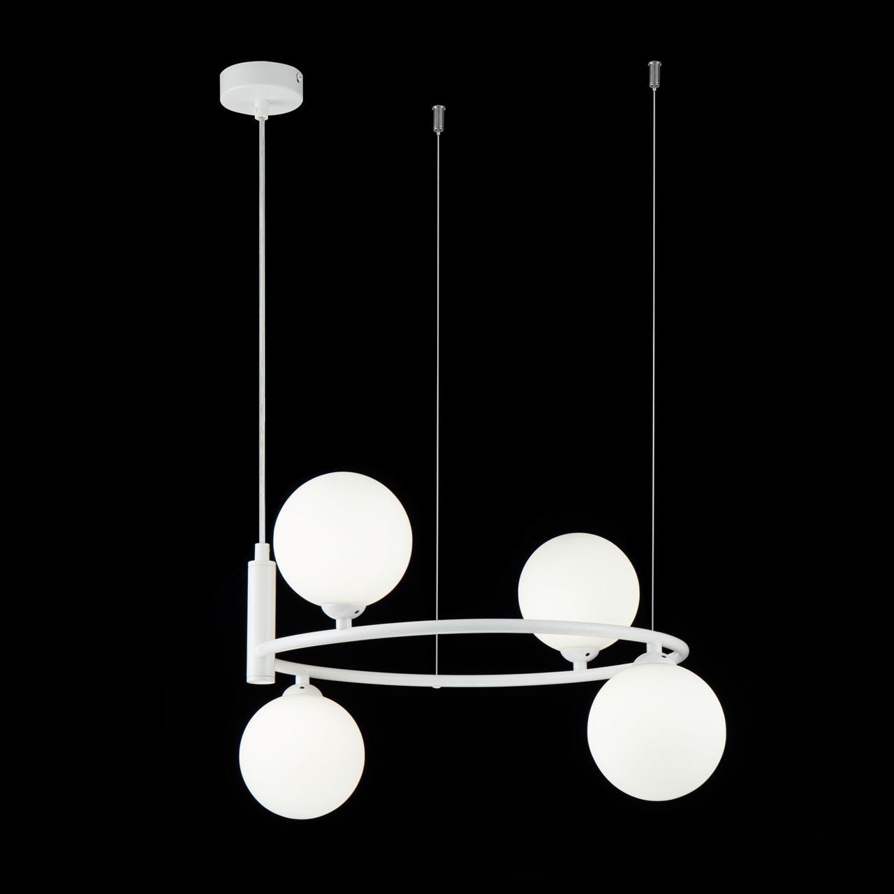 Подвесная люстра Maytoni Ring MOD013PL-04W, входящая в коллекцию Modern, отлично подойдет для освещения пространства в гостиной, на кухне, на даче, в кабинете, в баре, кафе и ресторане, оформленных в современном, в скандинавском стиле или в стиле Хай-тек. Данный артикул имеет четыре плафона белого цвета в форме шара, выполненных из стекла и направленных вниз и вверх, а также матовую белую арматуру, изготовленную из металла. Немецкий производитель Maytoni дает гарантию на свое изделие 2 года и рекомендует использовать для устройства энергосберегающие лампы с цоколем G9 по 25 Вт каждая лампа и общей мощностью 100 Вт, что позволяет осветить помещение площадью 5,6 кв. м. Технической особенностью этого осветительного прибора является возможность регулирования по высоте, при этом максимальная высота люстры составляет 184 см. Способ крепления светильника к потолку на планку позволяет быстро и просто осуществить монтаж, при этом подходит для всех типов потолков, в том числе и натяжных. Стильный дизайн, тип подвеса на тросиках и матовая поверхность подвесной люстры Maytoni Ring MOD013PL-04W делают ее особенным элементом декора, который украсит любое интерьерное пространство.