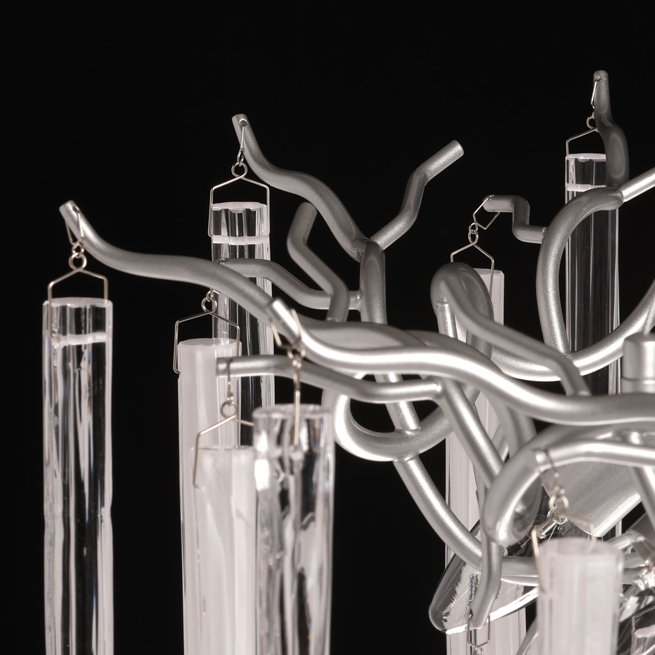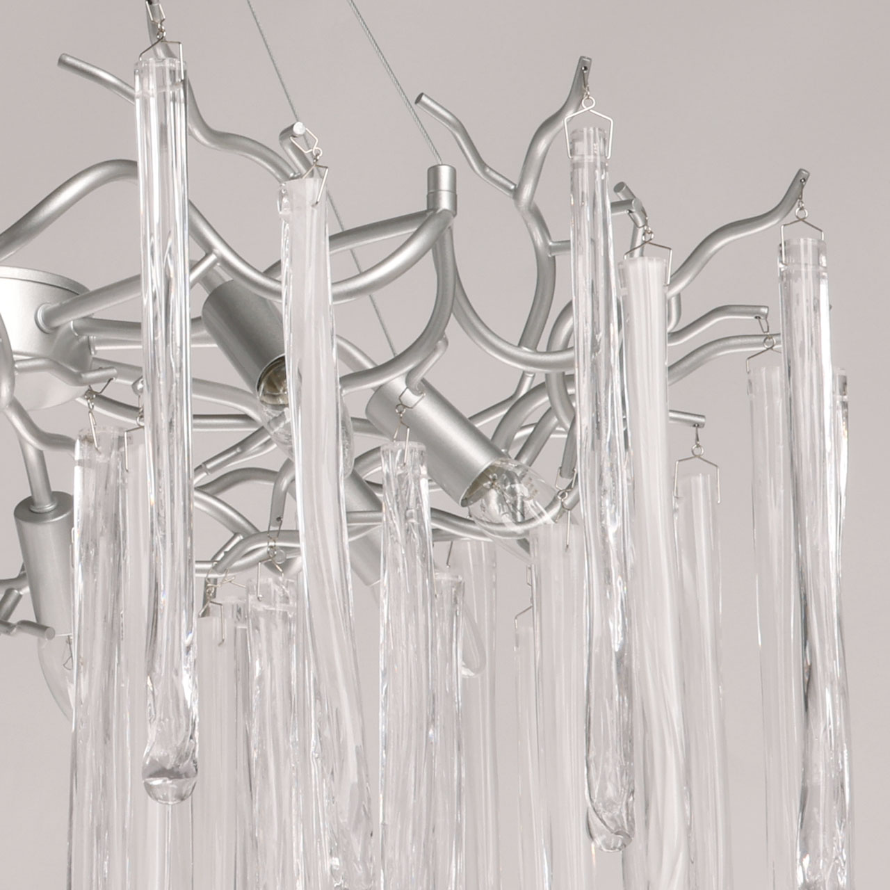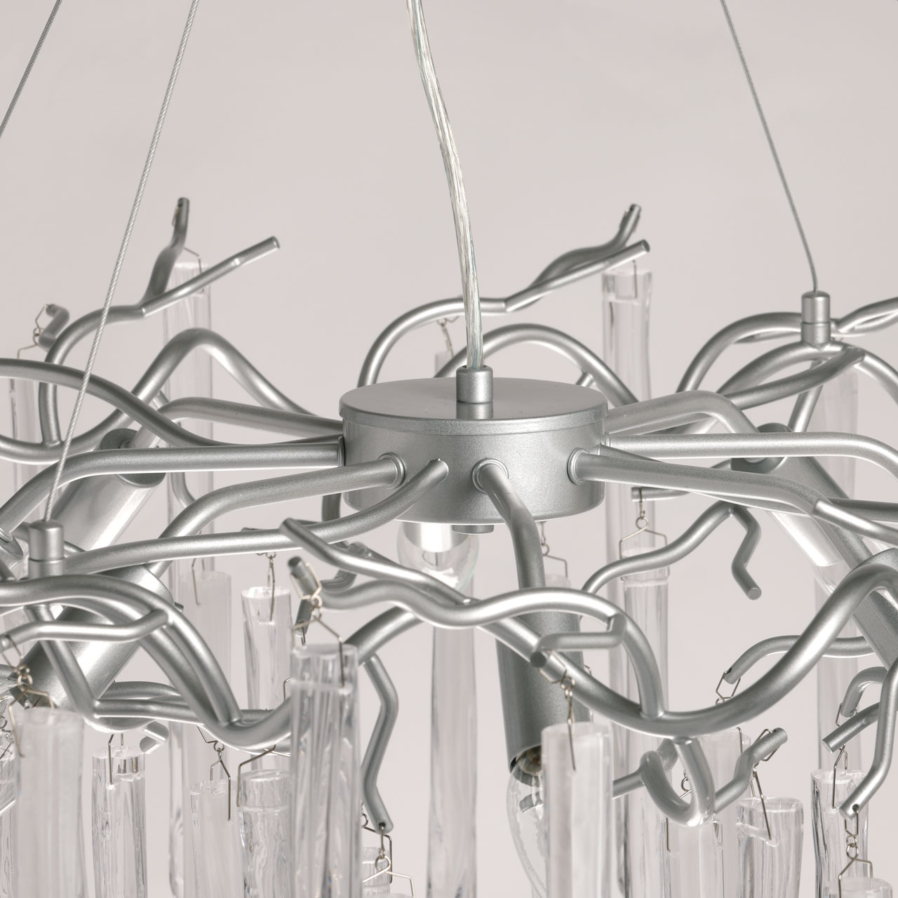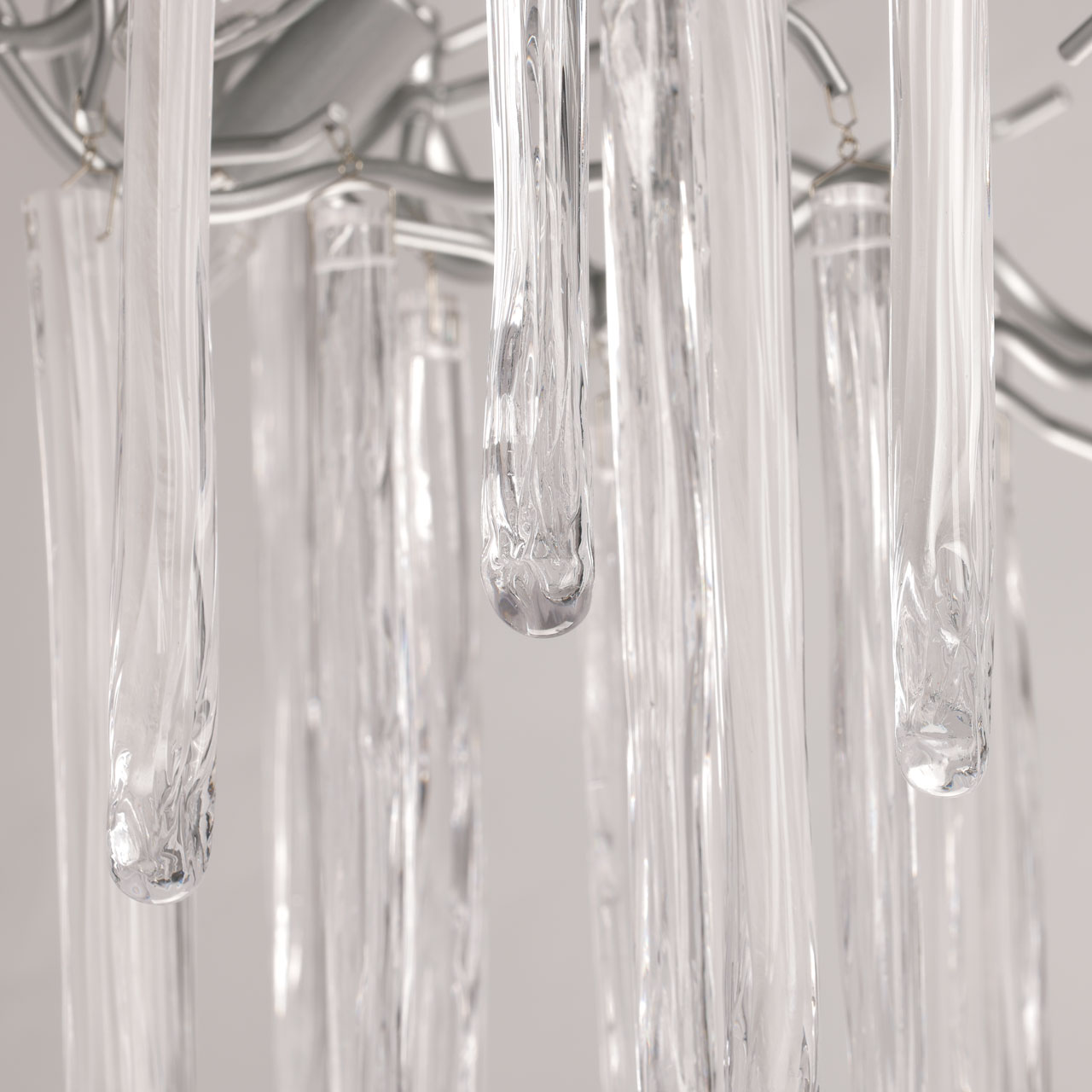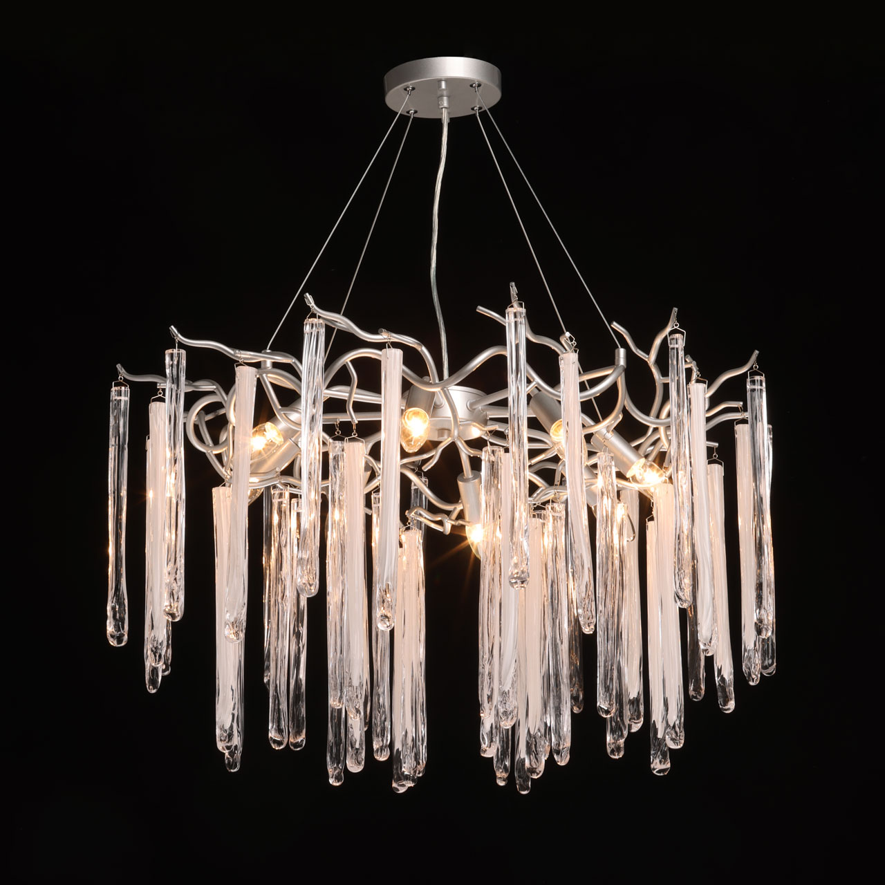 Металлическое основание подвесной люстры окрашено в цвет перламутрового серебра. Люстра декорирована прозрачными стеклянными подвесками и подвесками, окрашенными в белый цвет.