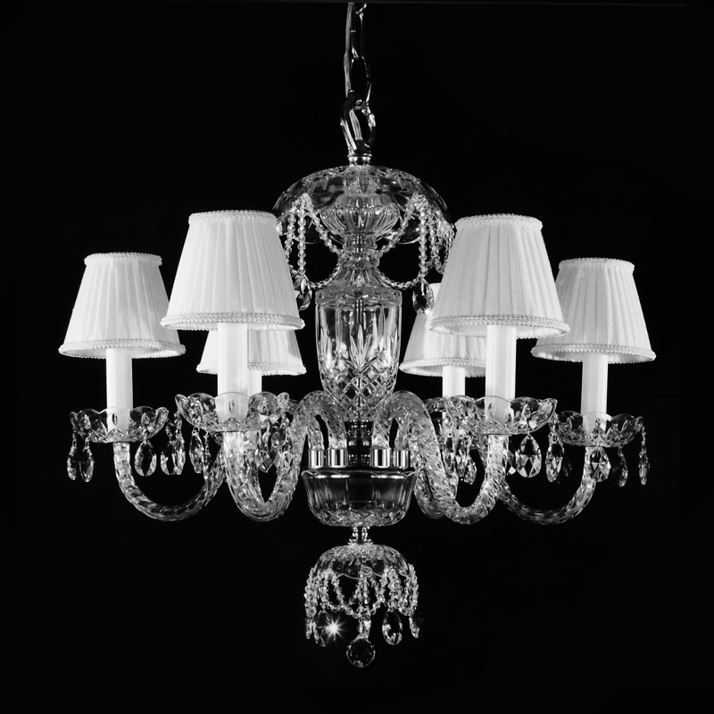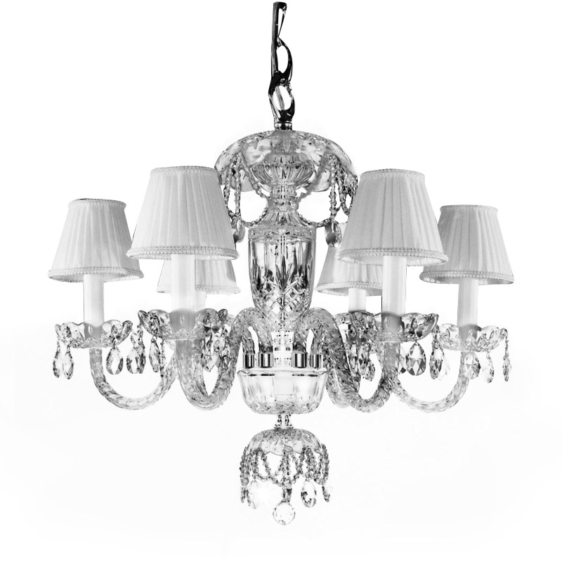 Люстра 6-ти рожковая на хромированной арматуре с хрустальной вазой и чашечками. Текстильные плиссированные абажуры белого цвета. Декор: хрустальные подвески и кристаллы Swarovski Spectra на арматуре. Высота светильника регулируется за счет звеньев цепи.