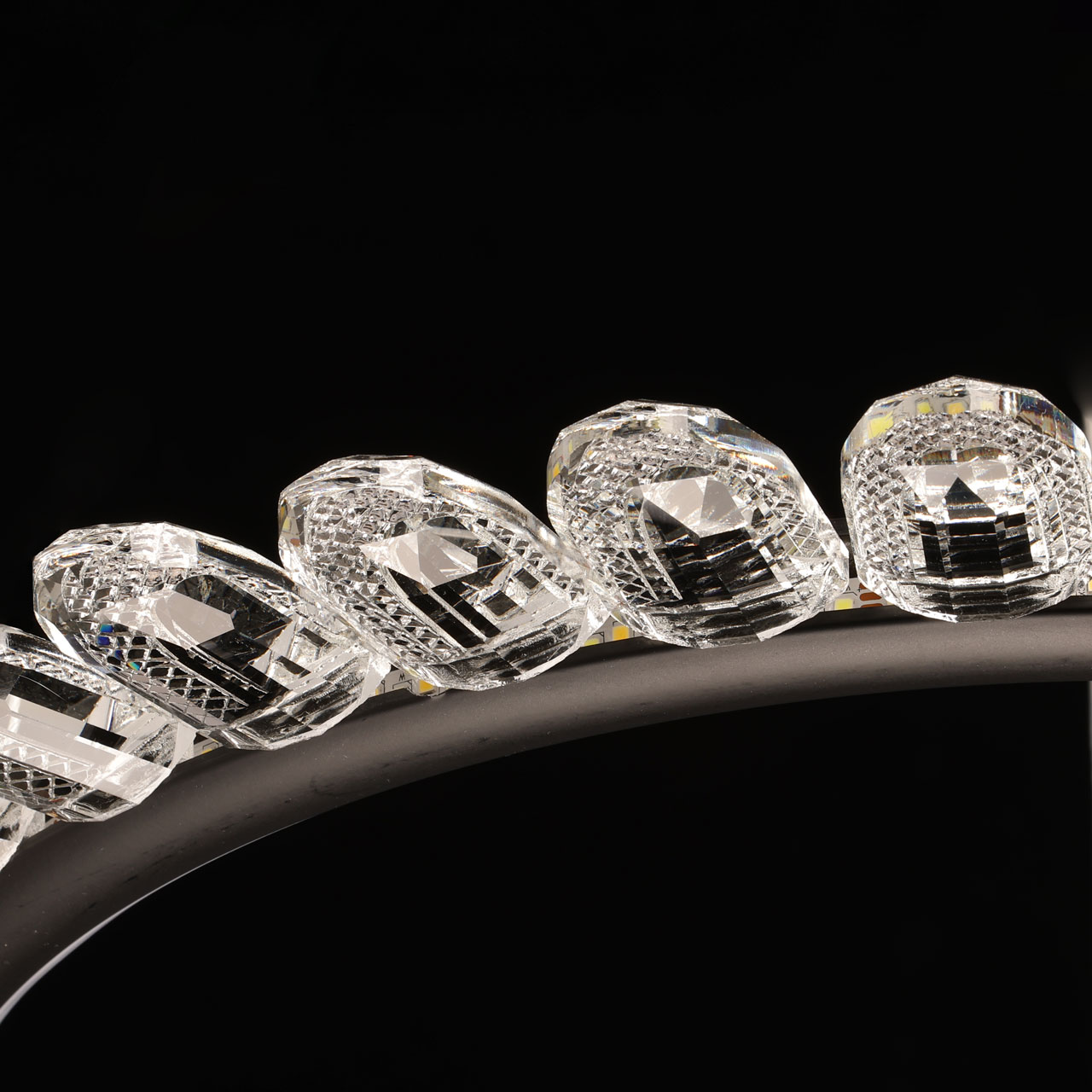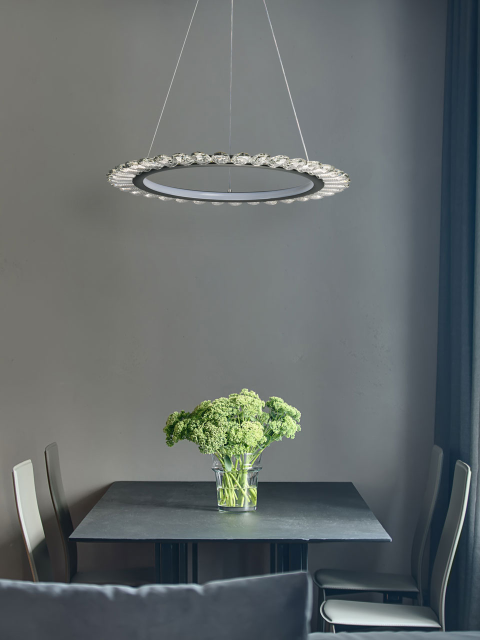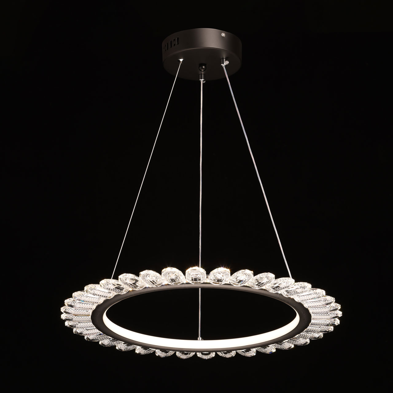 Металлическая потолочная чаша окрашена в черный цвет. Корпус плафона выполнен из сплава алюминия и окрашен в черный цвет. Светодиодные источники света закрыты белым силиконом. Люстра декорирована прозрачным акрилом.