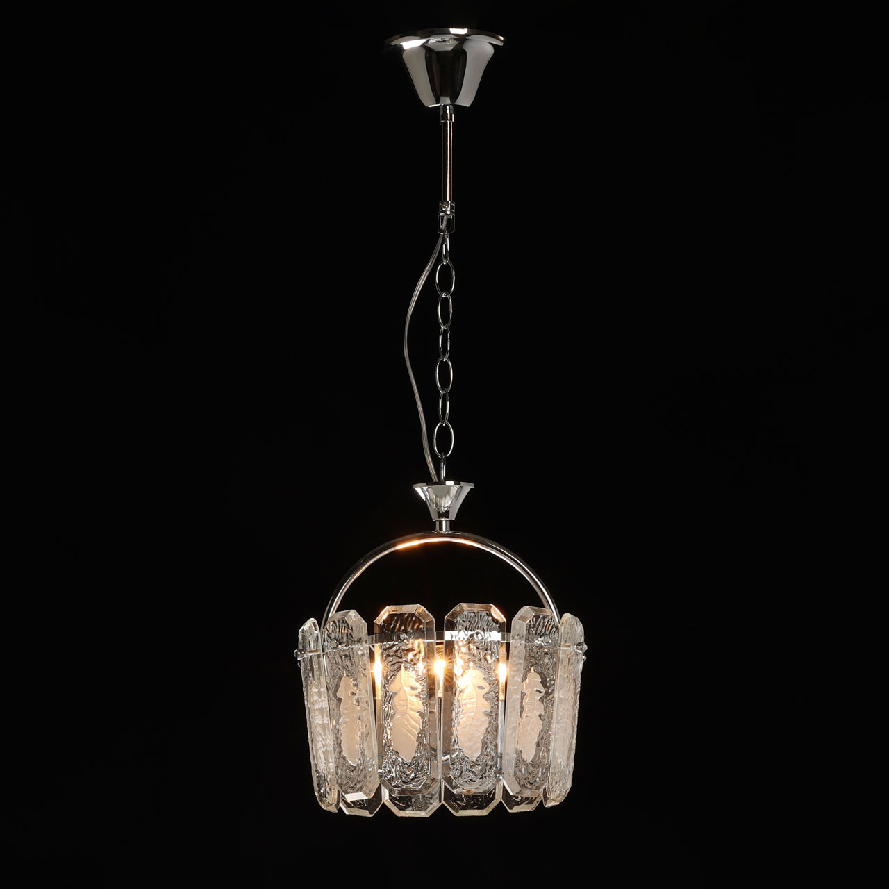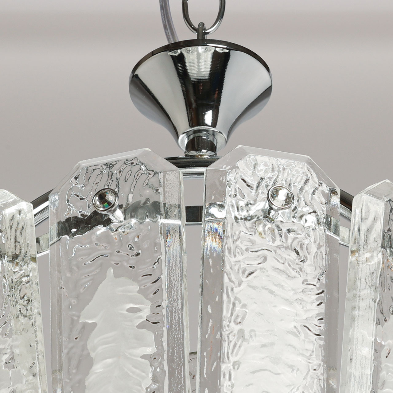 Металлическое основание люстры гальванизировано в цвет хрома. Плафон выполнен из прозрачного фактурного хрустального стекла овальной формы.
