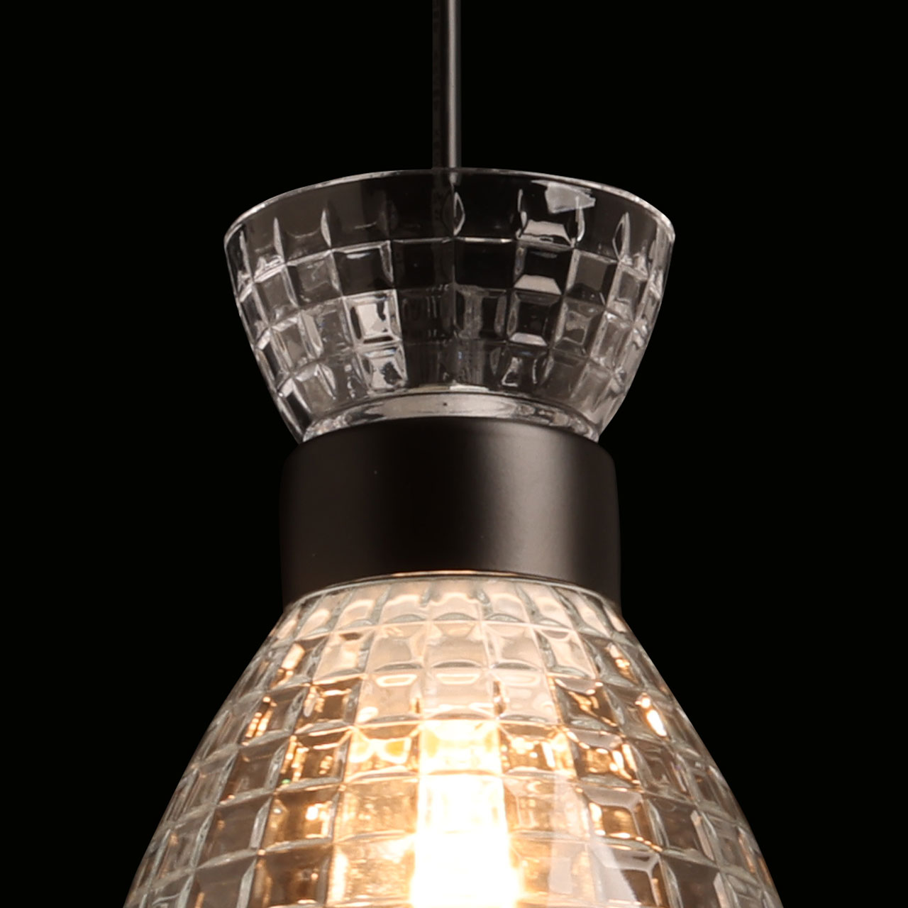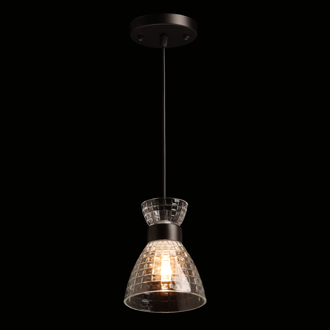 Металлическое основание подвеса окрашено в черный цвет. Прозрачный стеклянный плафон с геометричной фактурой отлит в сложную форму.