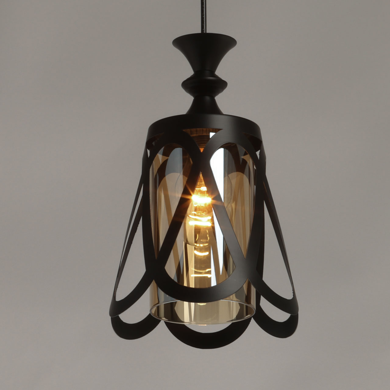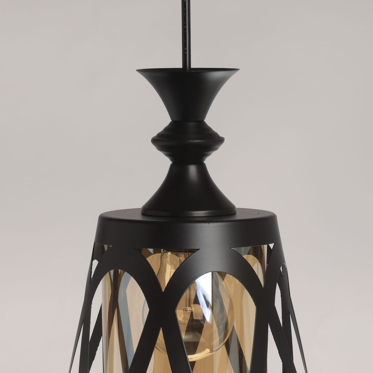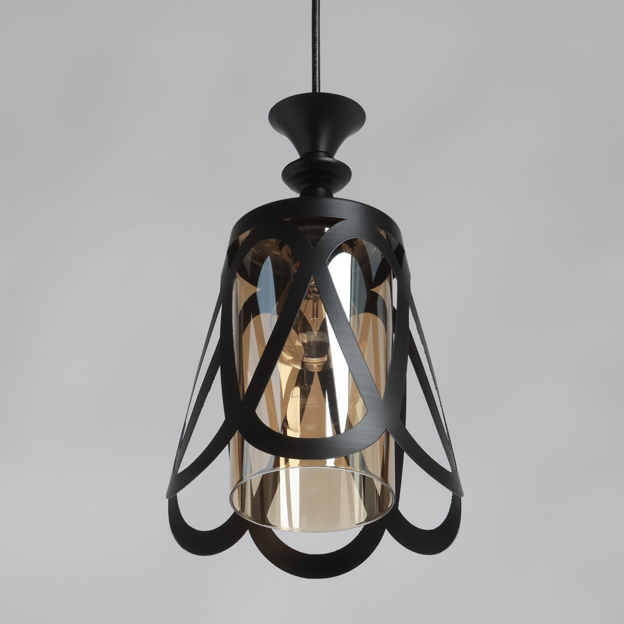 Металлическое основание подвеса окрашено в черный цвет. Источник света закрыт двойным плафоном. Внешний плафон выполнен из металла и окрашен в цвет основания. Внутренний плафон отлит из стекла, гальванизированного в цвет коньяк.