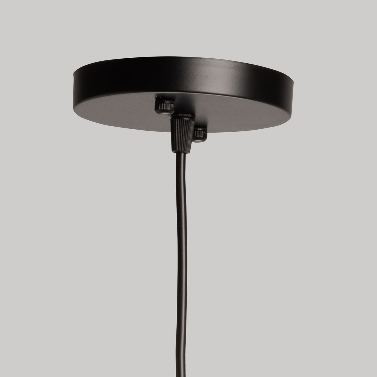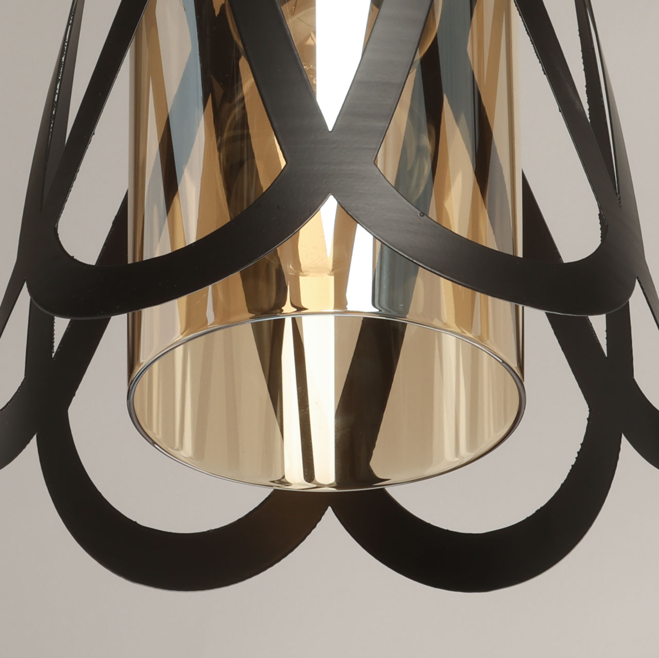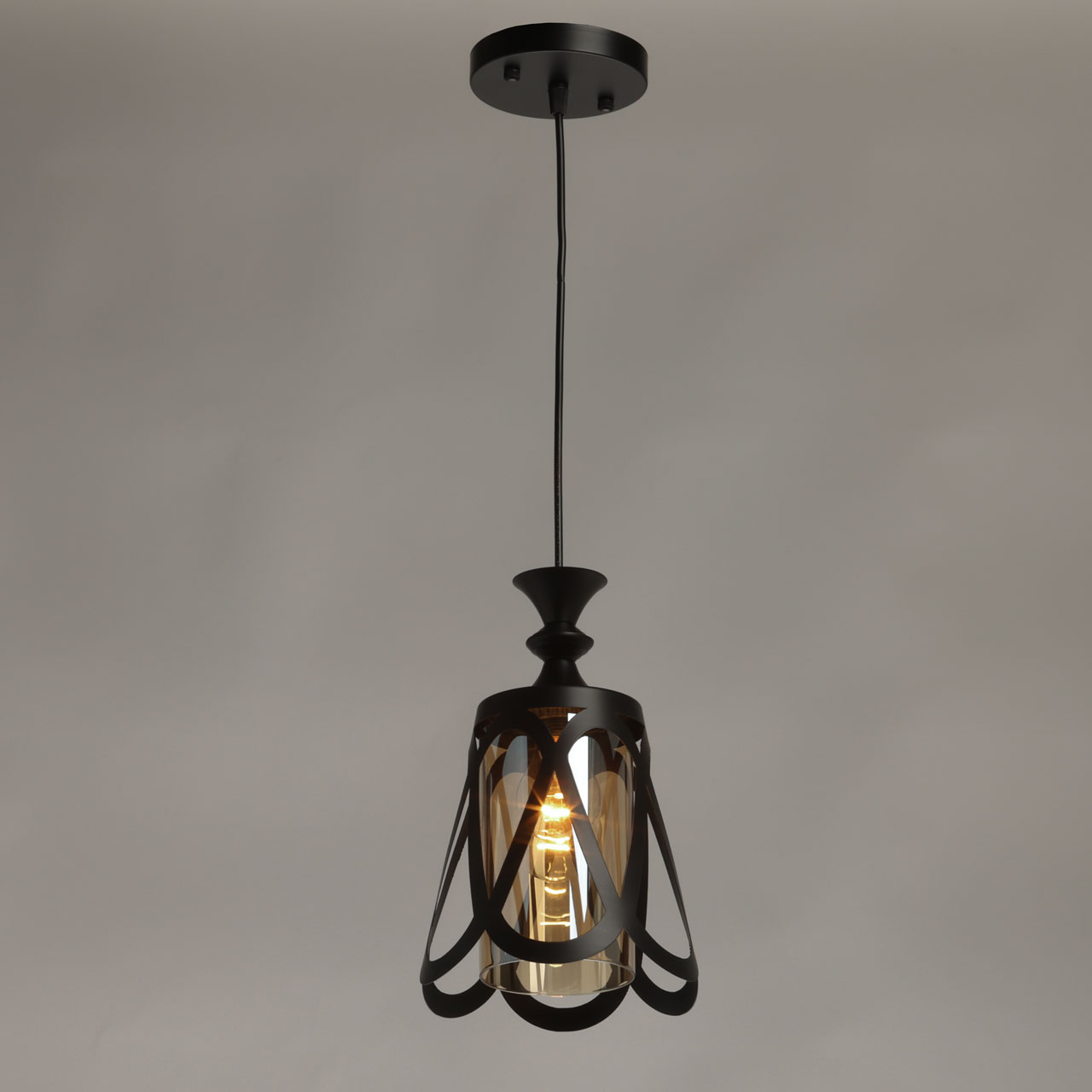 Металлическое основание подвеса окрашено в черный цвет. Источник света закрыт двойным плафоном. Внешний плафон выполнен из металла и окрашен в цвет основания. Внутренний плафон отлит из стекла, гальванизированного в цвет коньяк.