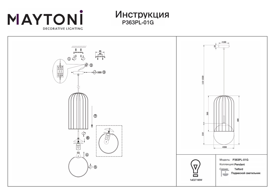 Купить "Подвесной светильник Maytoni Telford P363PL-01G"