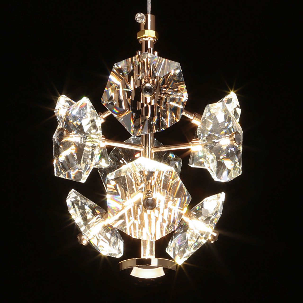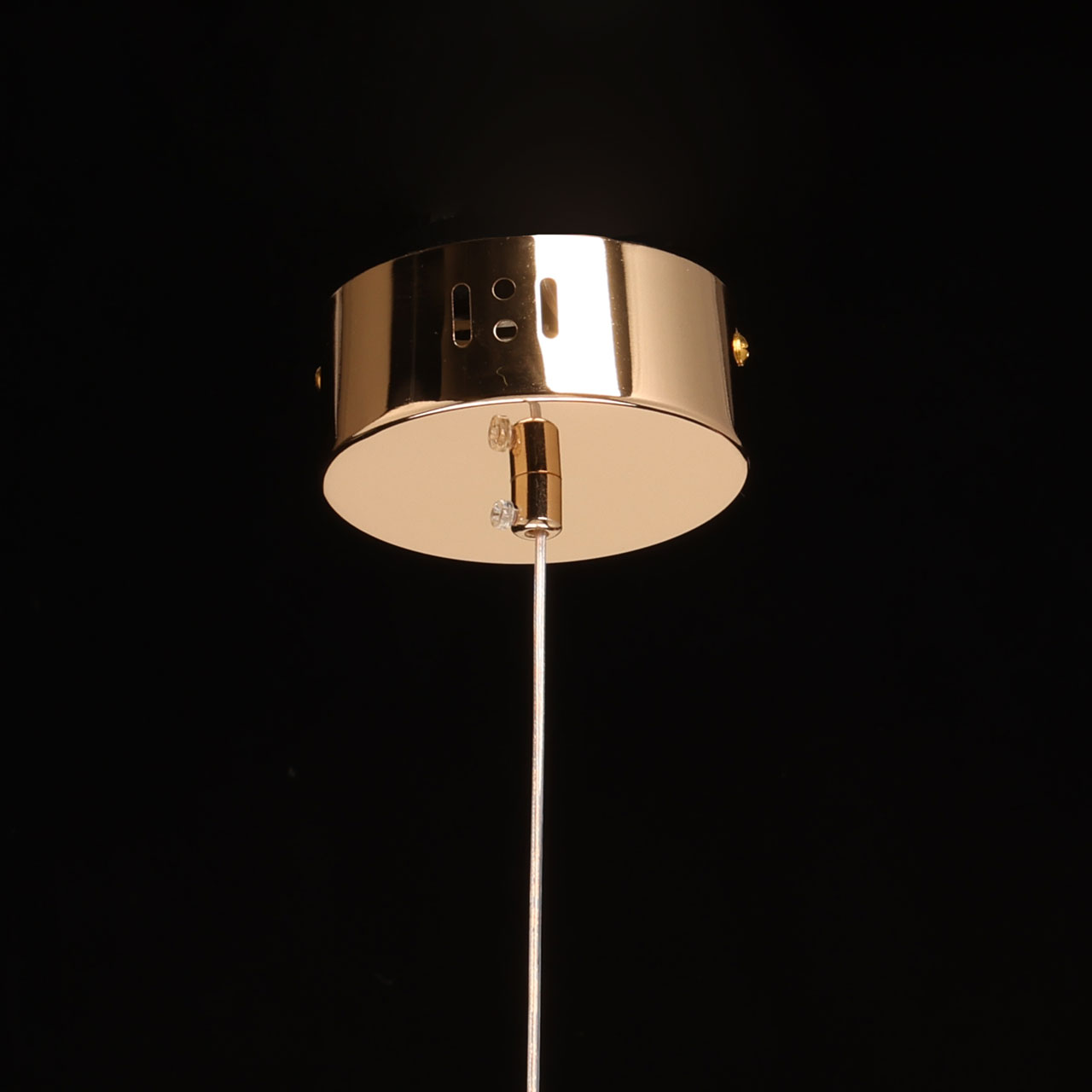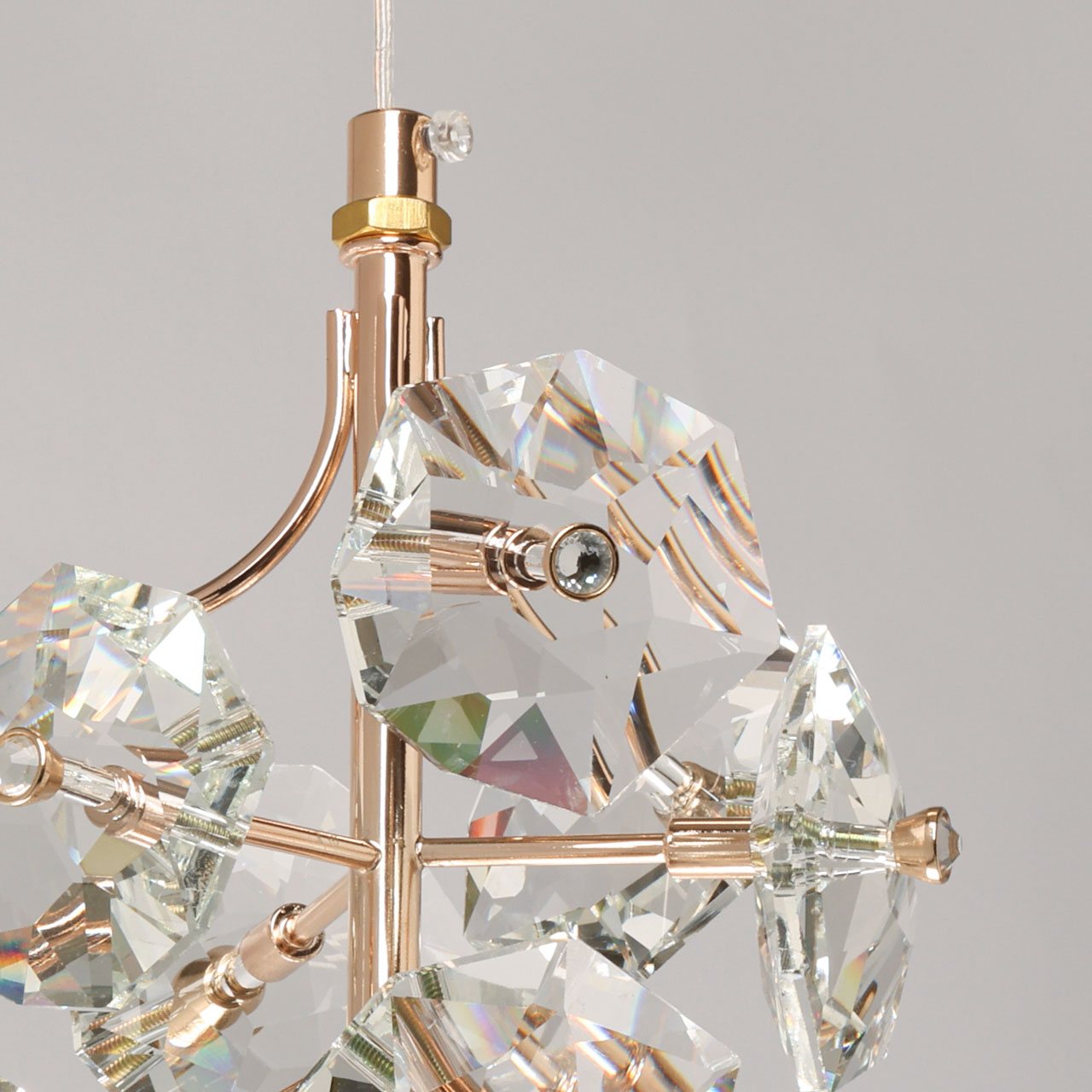 Металлическое основание подвеса гальванизировано в цвет золота. Подвес декорирован прозрачными хрустальными элементами.