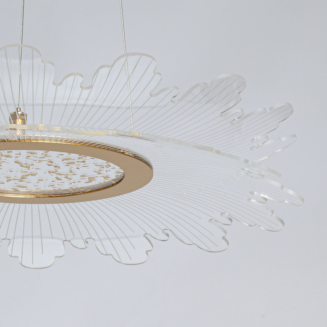 Металлическое основание светильника гальванизировано в цвет золота. Корпус плафона выполнен из сплава алюминия с цинком. Плафон выполнены из прозрачного акрила.