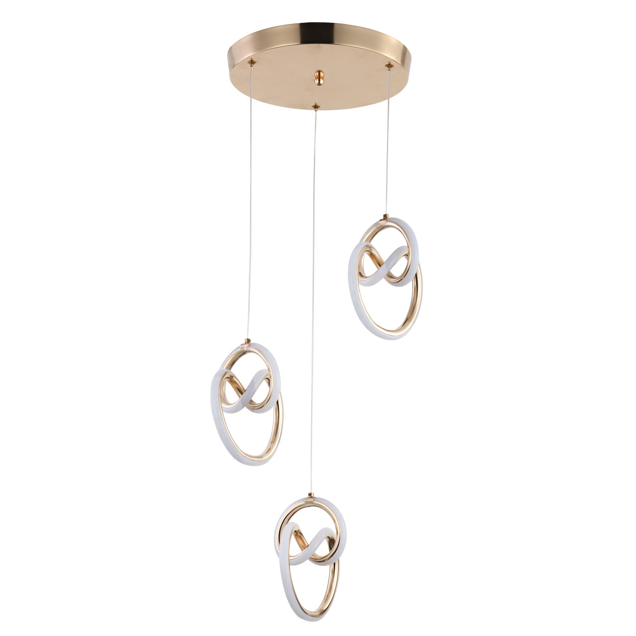 Металлическое основание подвесной люстры гальванизировано в цвет французского золота. Корпус плафонов выполнен из акрила и гальванизирован в цвет основания. Светодиодные источники света закрыты белым матовым силиконом.