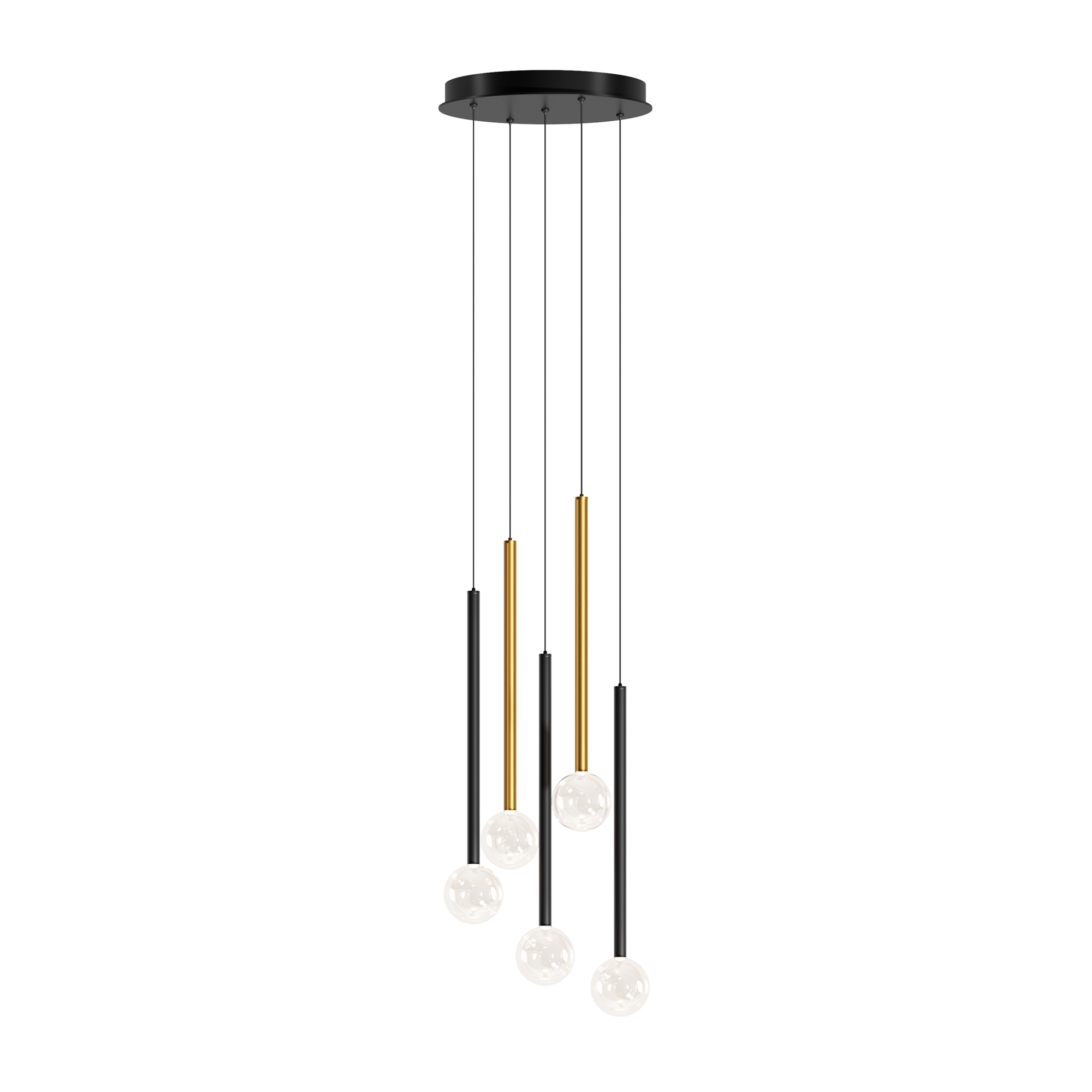 Цвет арматуры — черный, латунь, комбинация черный и латунь. Материал арматуры — металл. Цветовая температура 3000К. Оригинальный «невесомый» дизайн с тонкими металлическими трубками и стеклянными шарами-плафонами. LED-источники света. Регулируемая длина провода подвесных светильников, 3 метра, подходит для помещений с высокими потолками. Каскадная композиция на 7 и 15 плафонов оснащена проводом длиной 3,5 метра для эффектных дизайнерских решений. Подходит для высоких потолков. Парящие модели для создания легкой, воздушной атмосферы в интерьере.