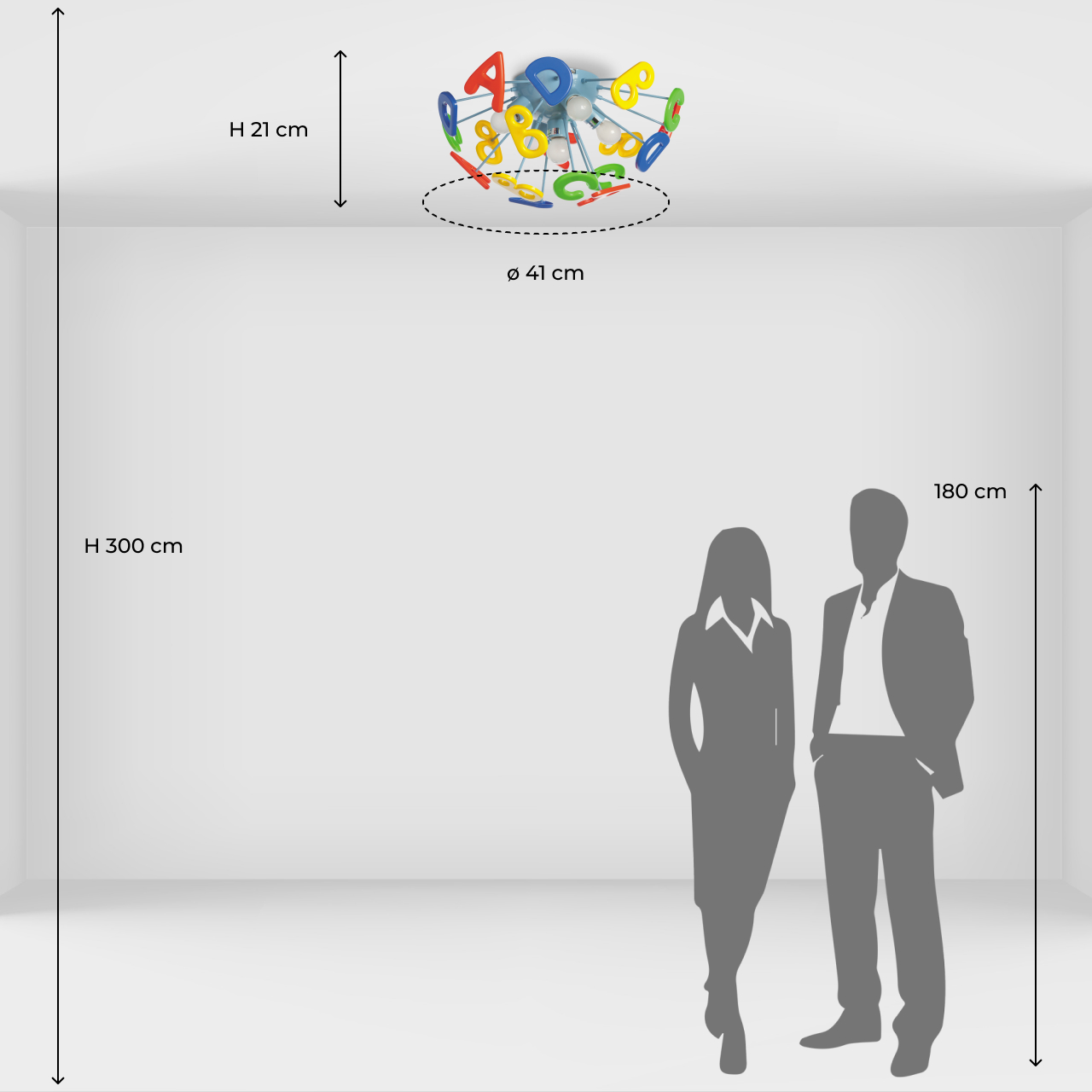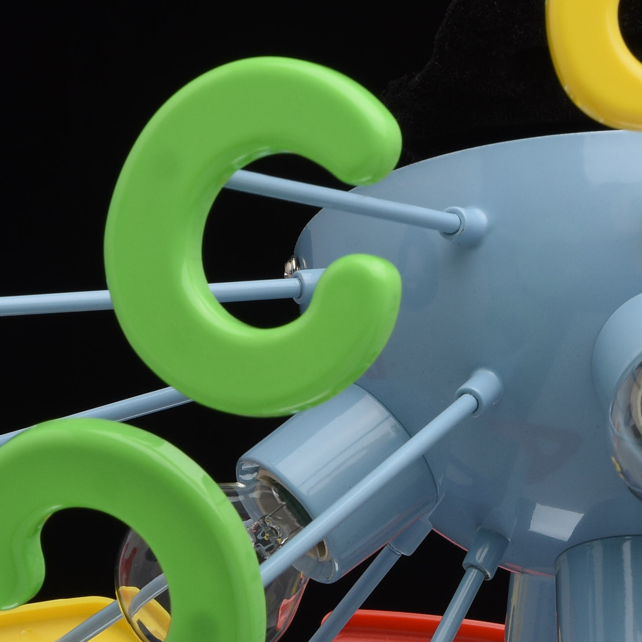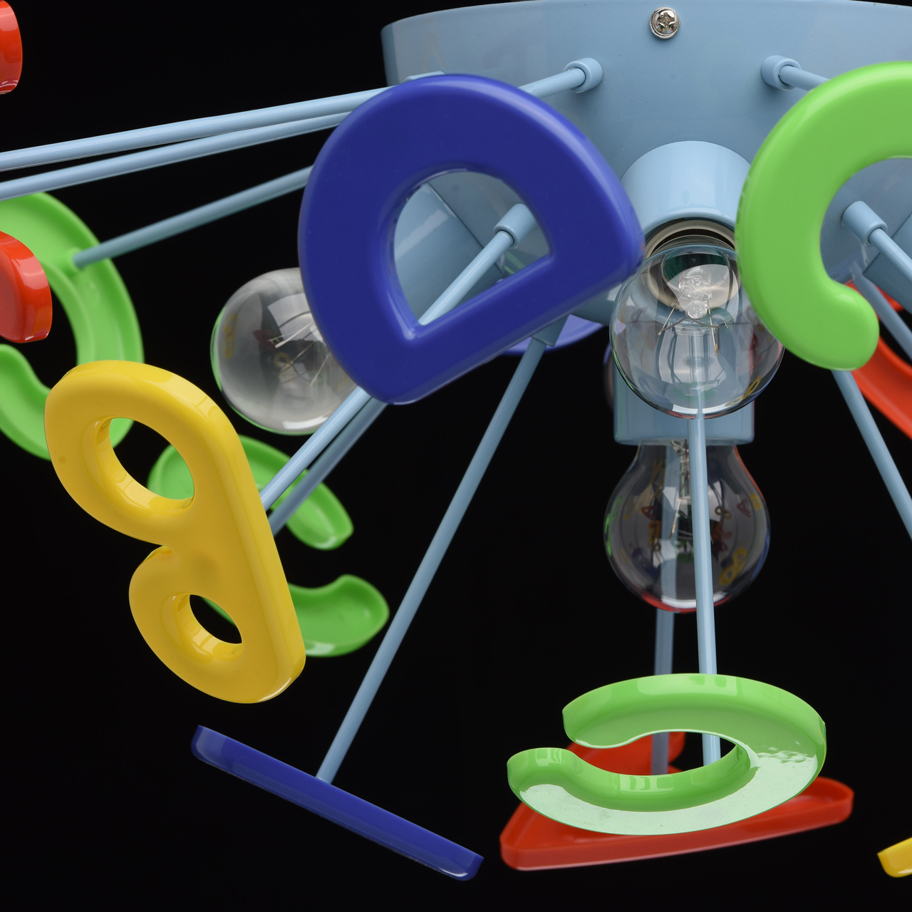 Основание светильника выполнено из сплава металла и окрашено в синий цвет. Светильник декорирован латинскими буквами из высококачественного акрила, окрашенного в разные цвета.