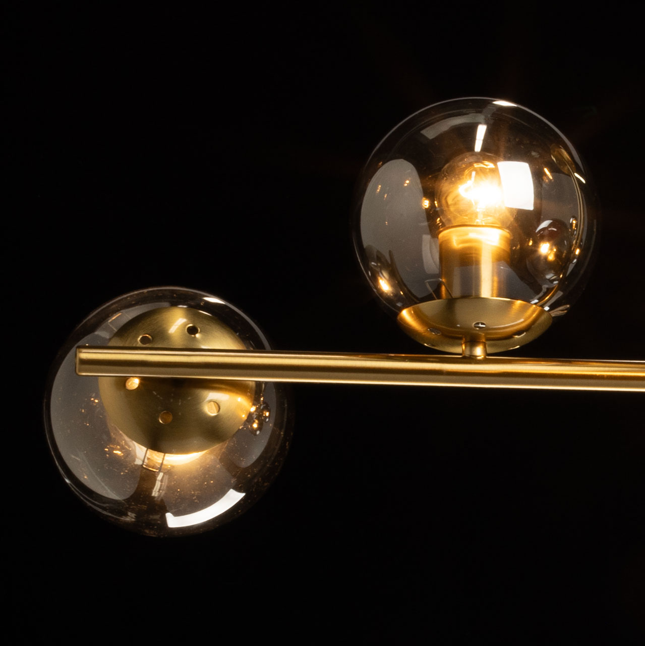 Металлическое основание гальванизировано в цвет меди. Заменяемые источники света скрыты за стеклянными плафонами, которые также гальванизированы медью, но уже в дымчатом оттенке.