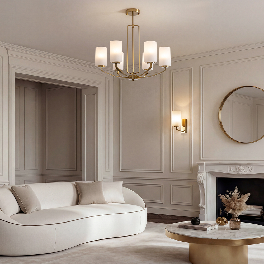 Арматура — металл, латунь. Стеклянные белые абажуры рассеивают свет. Центральное основание создаёт воздушность конструкции. Лампы E14 (5/6 шт., не в комплекте).