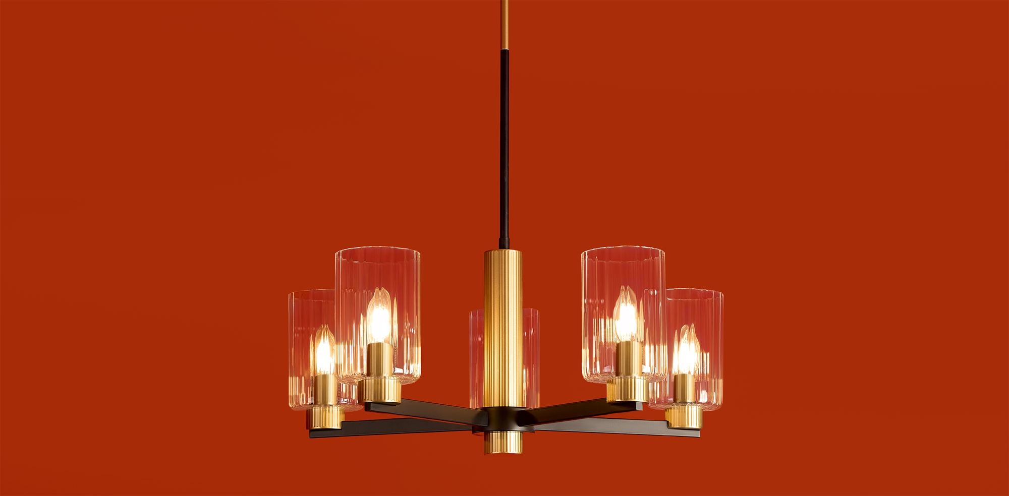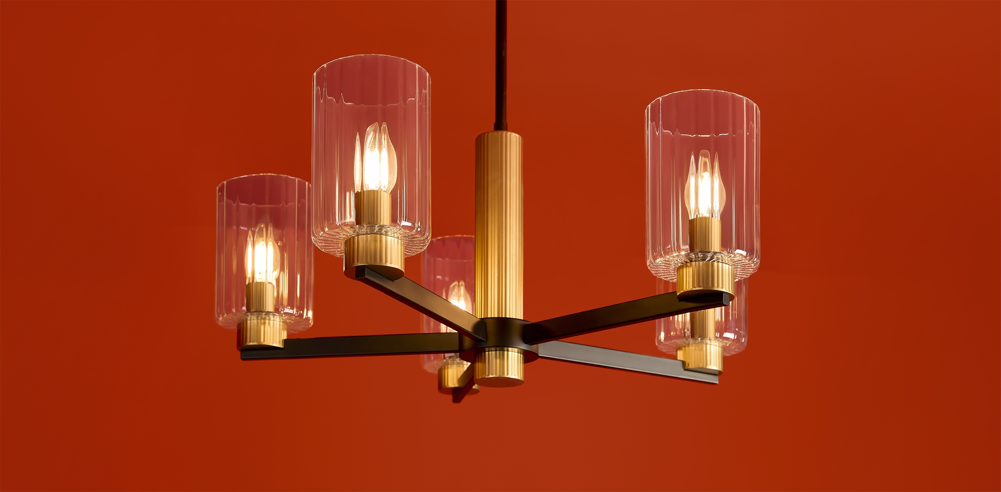 Металлическая арматура чёрного матового цвета с латунными вставками. Прозрачные цилиндрические стеклянные абажуры. Лампы E14 (не включены). Трендовое сочетание для современных интерьеров.