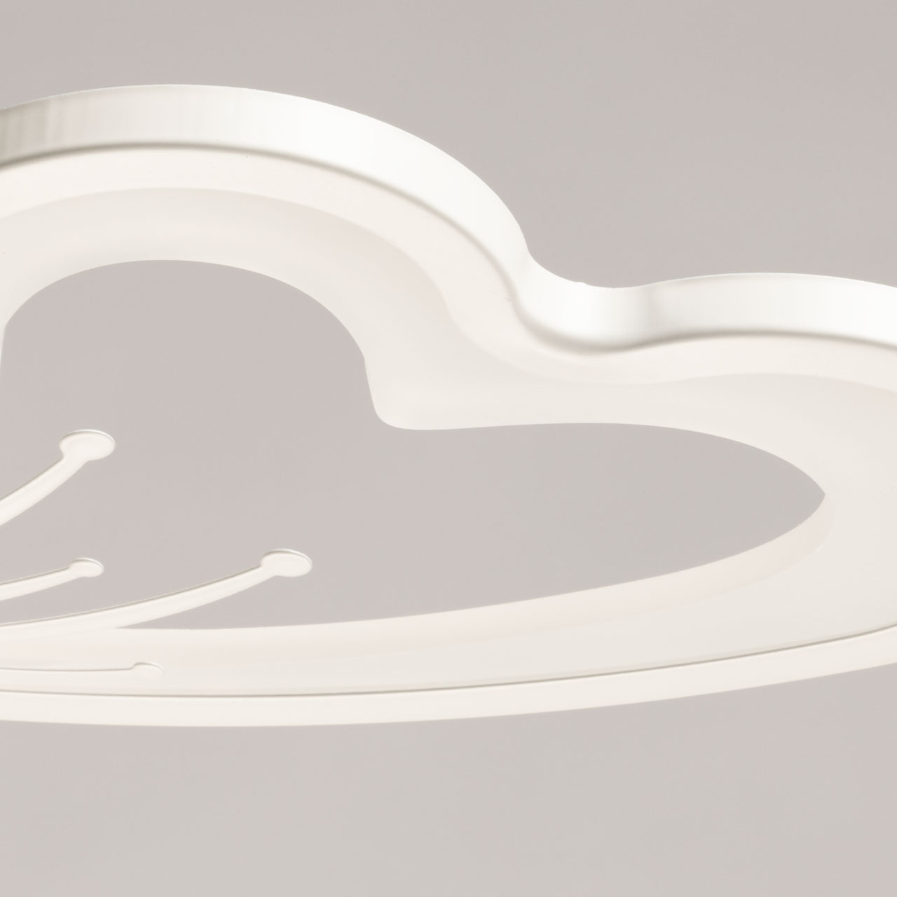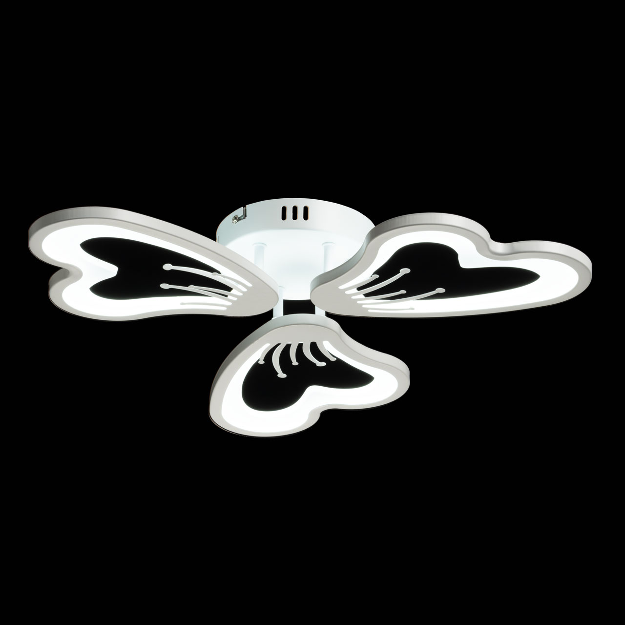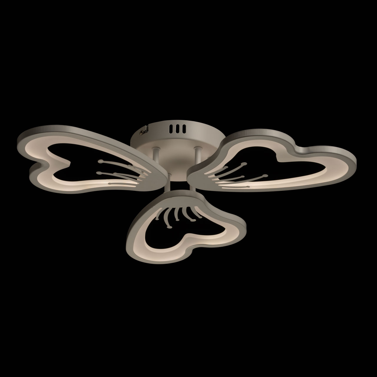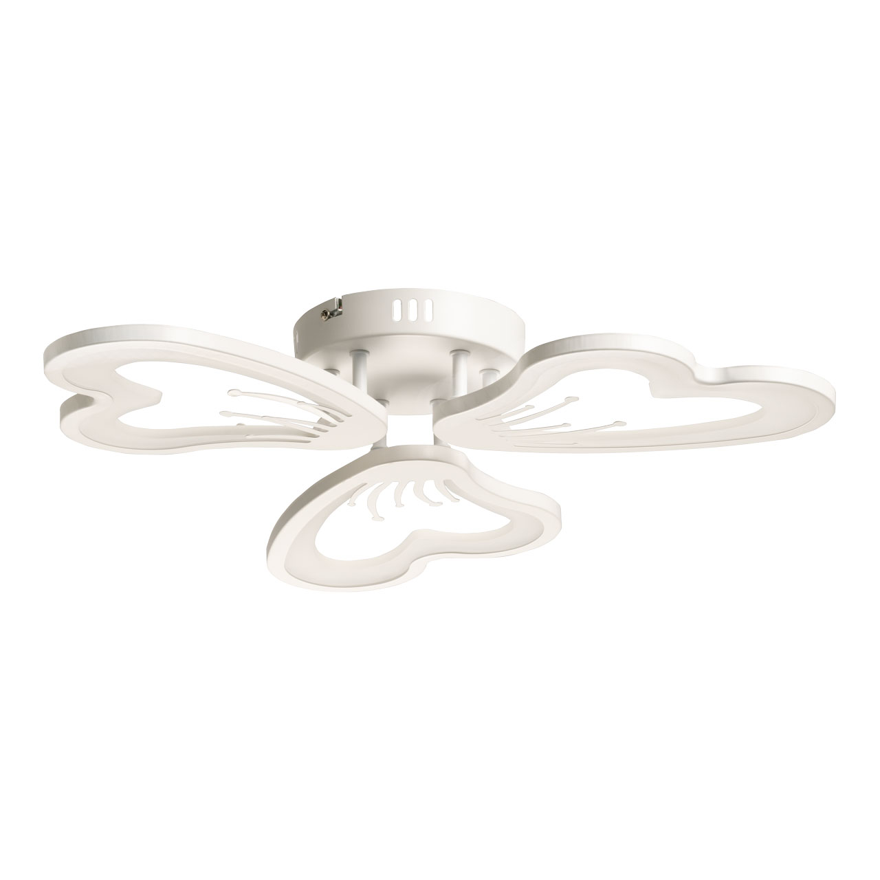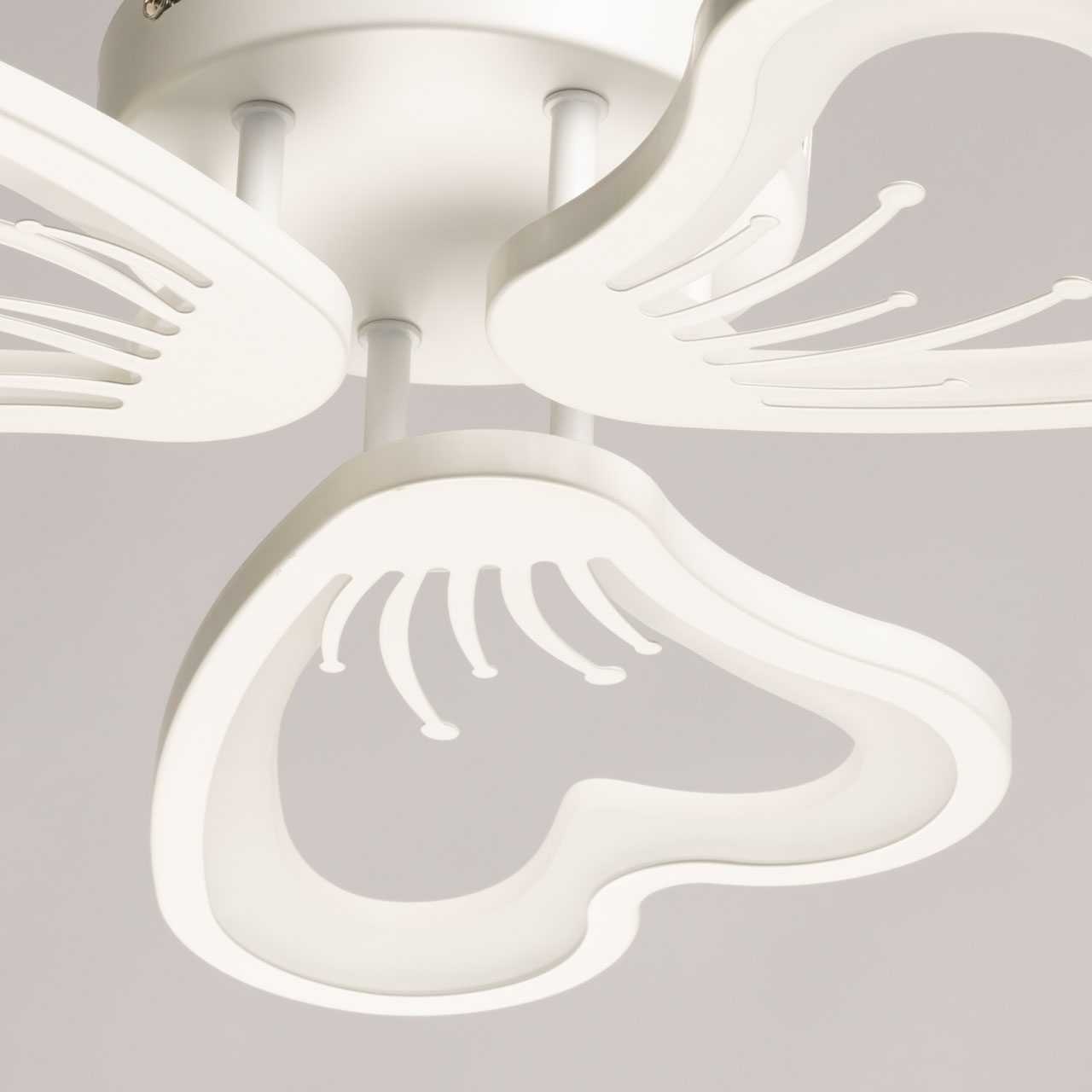 Металлическое основание потолочной люстры окрашено в белый цвет. Корпус плафонов выполнен из сплава алюминия с цинком и окрашен в цвет основания. Светодиодные источники света закрыты белым матовым акрилом.