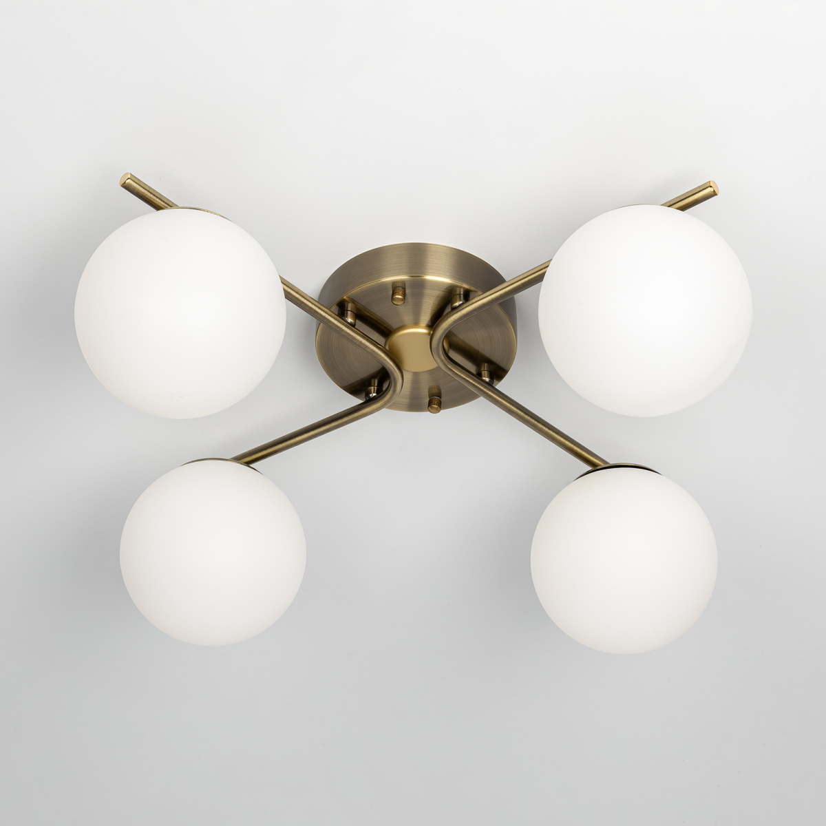 Люстра четырёхрожковая с круглым основанием, корпус металлический, цвет благородная бронза. Плафоны в форме шара, изготовлены из оптического полимера, цвет белый матовый. Внутри каждого плафона расположена уникальная светодиодная панель, обеспечивающая яркое основное освещение или красочную RGB подсветку, с плавной регулировкой яркости во всех режимах света.