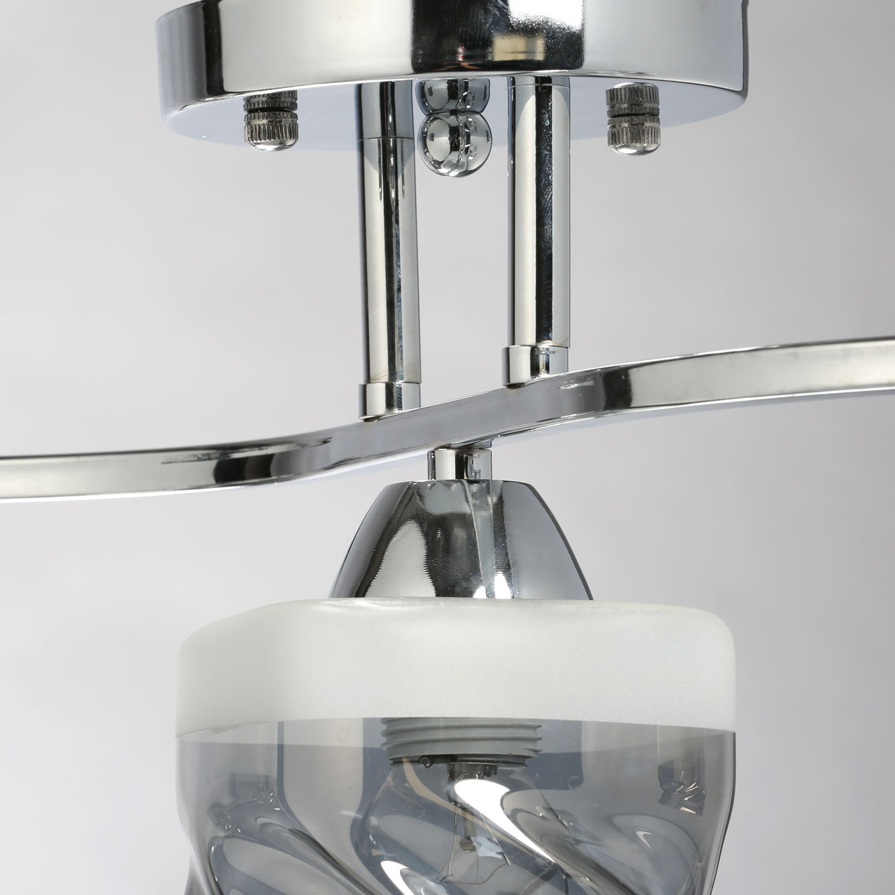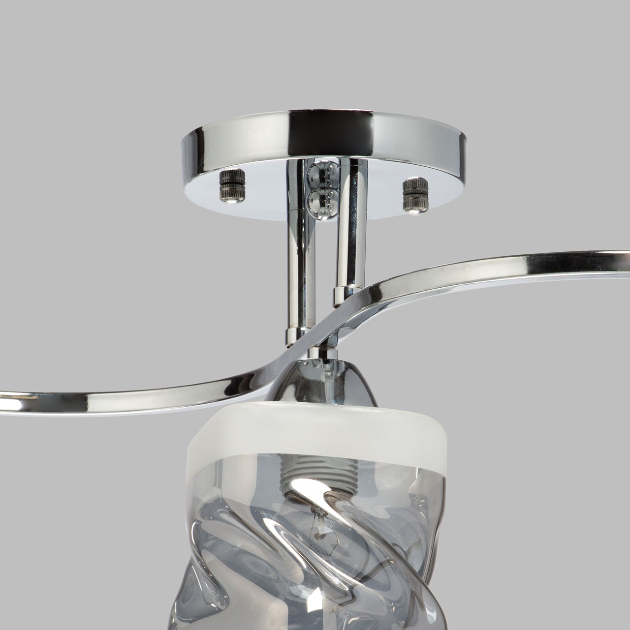 Металлическое основание светильника гальванизировано в цвет хрома. Стеклянные плафоны отлиты в сложную перекрученную форму и гальванизированы в дымчатый цвет. У основания плафоны окрашены в белый цвет.