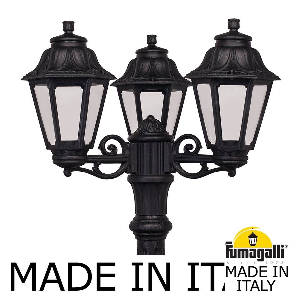 Садово-парковый фонарь FUMAGALLI серии ANNA, модель ANNA /GIGI/BISSO 3+1. Парковый торшер, столб GIGI с тремя уличными фонарями ANNA на двух малых консолях BISSO и одним светильником на опоре. Используются для архитектурного и ландшафтного освещения в стиле "классика". Место установки столбиков освещения - парковые дорожки, cкверы, садовые участки, тротуары, а так же ландшафтные и архитектурные объекты. Могут устанавливаться и внутри помещений в качестве декоративных уличных фонарей. Изготовлены в Италии, по уникальным технологиям "FUMAGALLI" из современного композитного полимера RESIN. Этот материал в 5 раз прочнее металла, не ржавеет, не окисляется, не выгорает на солнце, его не нужно красить. Все светильники пыле-влаго защищены по стандарту IP55 (защита от пыли, защита от струй воды, падающих под любым углом). Рассеиватель выполнен из антивандального, не мутнеющего и не горючего PMMA (ПолиМетилМетаАкрилат). Срок службы светильника - не менее 20 лет. Температура использования от -60 до +90. В серии ANNA есть фонари в настенном (BISSO/ANNA, PORPORA/ANNA) подвесном (SICHEM/ANNA, SICHEM/ANNA 3L) и наземном исполнении (IAFAET.R/ANNA, ALOE.R/ANNA, ARTU/ANNA, GIGI/ANNA, RICU/ANNA, RICU/ISSO/ANNA 1L, RICU/ISSO/ANNA 2L, RICU/ISSO/ANNA 3L) со столбами разной высоты, с разным количеством и конфигурацией голов. Консоли настенных фонарей и кронштейны светильников на столбах освщения могут устанавливаться вверх/вниз. Столбы выше 150 см имеют в основе мощную стальную трубу с двойной оцинковкой. При заказе требуется выбрать цвет корпуса, цвет плафона и тип патрона (Е-27 или LED GX-53). Возможен светодиодный вариант. По стилю и дизайну серия уличных светильников ANNA похожа на светильники среднего размера серии RUT и на светильники большого размера серии NOEMI. По размеру ANNA относится к малым светильникам как серия SABA и GLOBE 250.