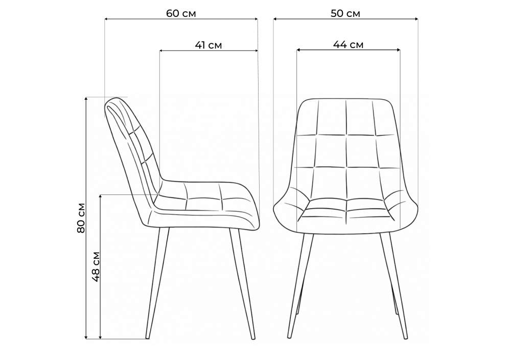 Материал каркаса - металл; Материал сиденья - велюр; Материал обивки - велюр; Цвет ножек - белый; Ширина - 50; Глубина - 60; Высота - 80; Ширина сиденья - 44; Глубина сиденья - 41; Высота сиденья - 48;