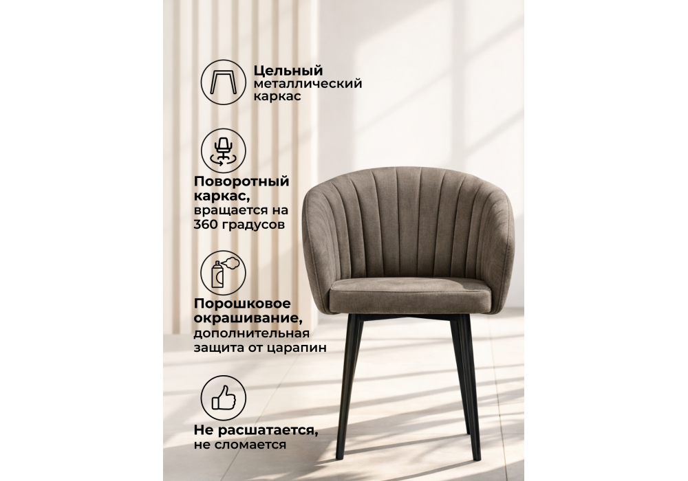 Стул «Моншау» — это идеальное сочетание прочной инженерной мысли и тактильного удовольствия. Его основа — надежный каркас из толстостенного металла, а изюминка — роскошный велюр с уникальной матовой текстурой. Этот стул создан для тех, кто ценит долговечность, комфорт и сдержанную эстетику.