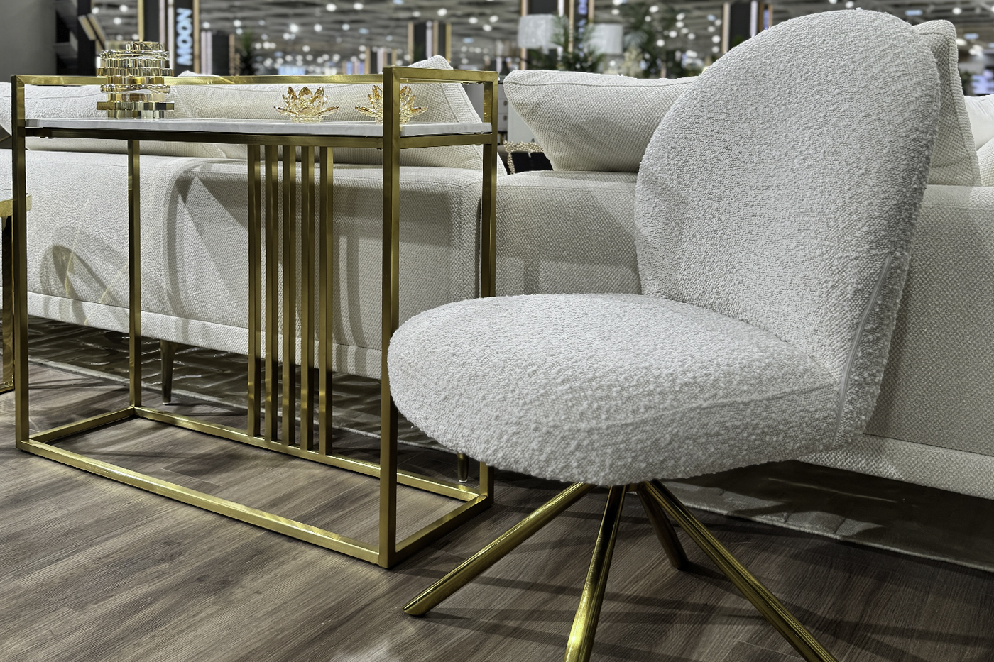 Оригинальный обеденный стул с вращающимся сиденьем и стильной обивкой из белоснежного букле. Современный дизайн встречается с классическим комфортом в этом стуле. Сочетание обтекаемых линий, мягкой обивки и блестящего каркаса придает ему особый шарм. Мягкая обивка из белоснежного букле создает ощущение невесомости и уюта, словно вы парите в облаке. Элегантный золотистый каркас придает стулу изысканность и роскошный вид, а вращающийся механизм добавляет функциональности. Этот стул станет идеальным дополнением для любой современной гостиной или стильной кухни. Обеденный стул с обивкой из белой ткани букле. Основание – сталь цвета брашированное золото с поворотно-возвратным механизмом. После поворота пружина плавно возвращает сиденье со спинкой в исходное положение.