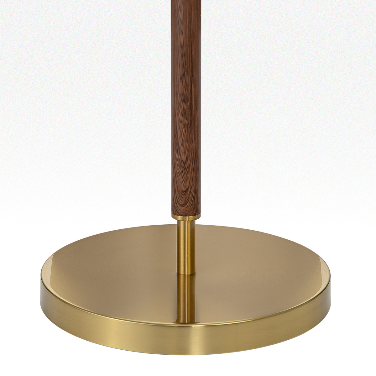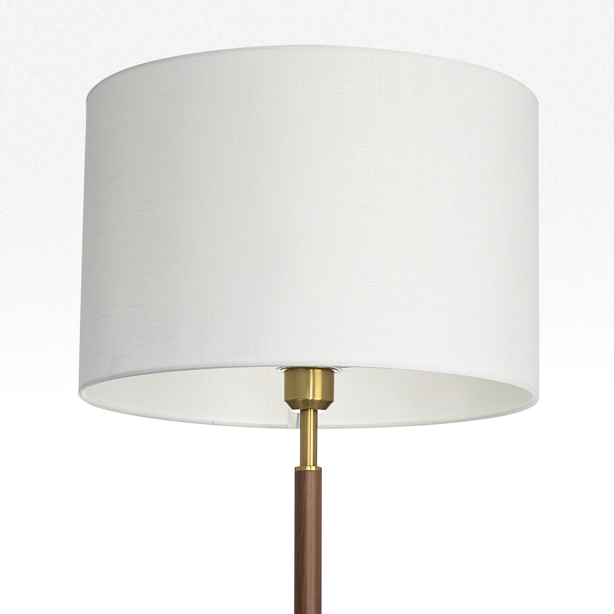 Бронзовый металлический каркас с декоративными элементами с текстурой под дерево. Абажур — в форме цилиндра, изготовленный из молочно-белой ткани с чуть шероховатой текстурой.