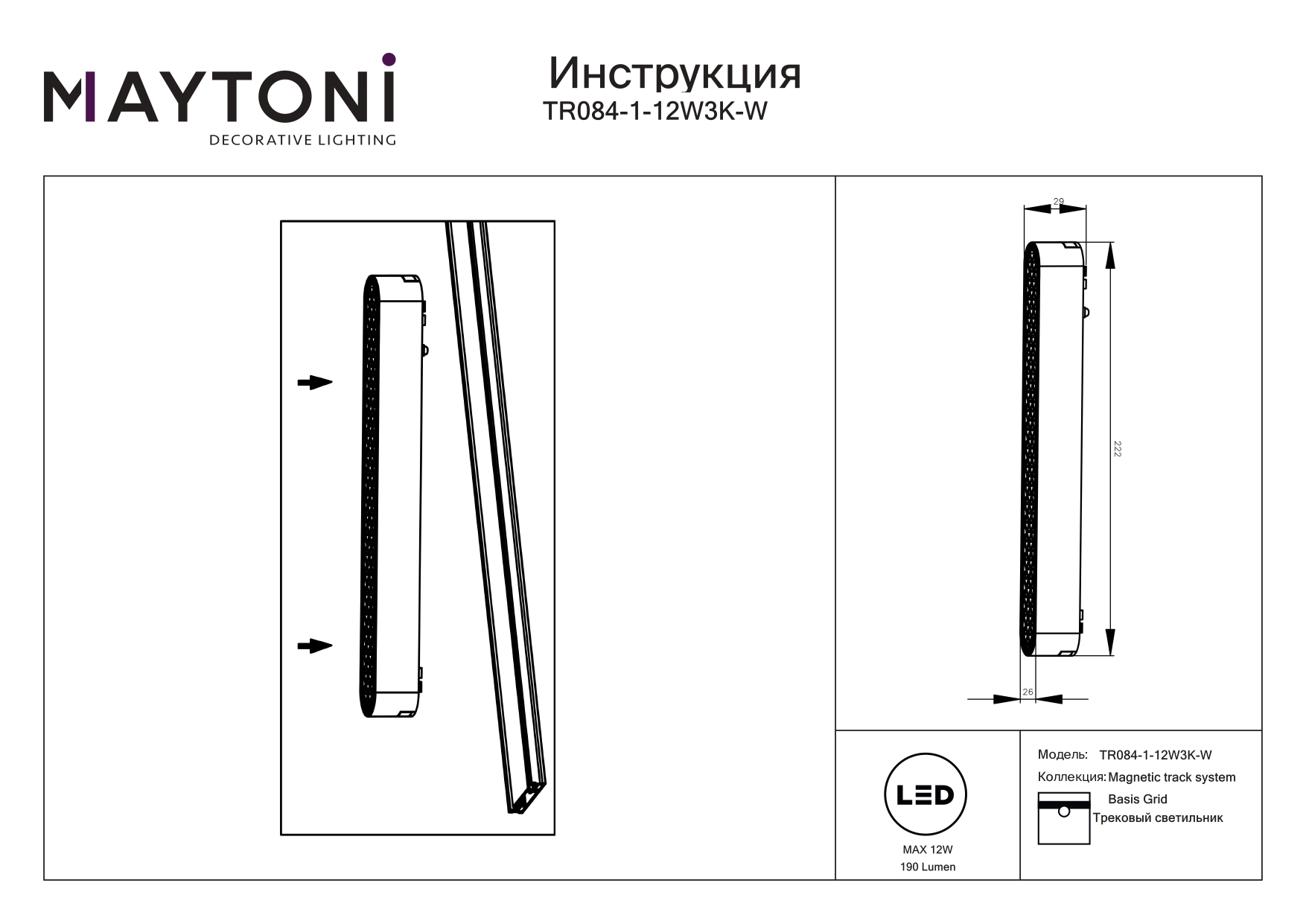 Мощность связана с величиной светового потока люмен (Lm), и от неё зависит яркостью лампы. - Общая мощность: 12 W