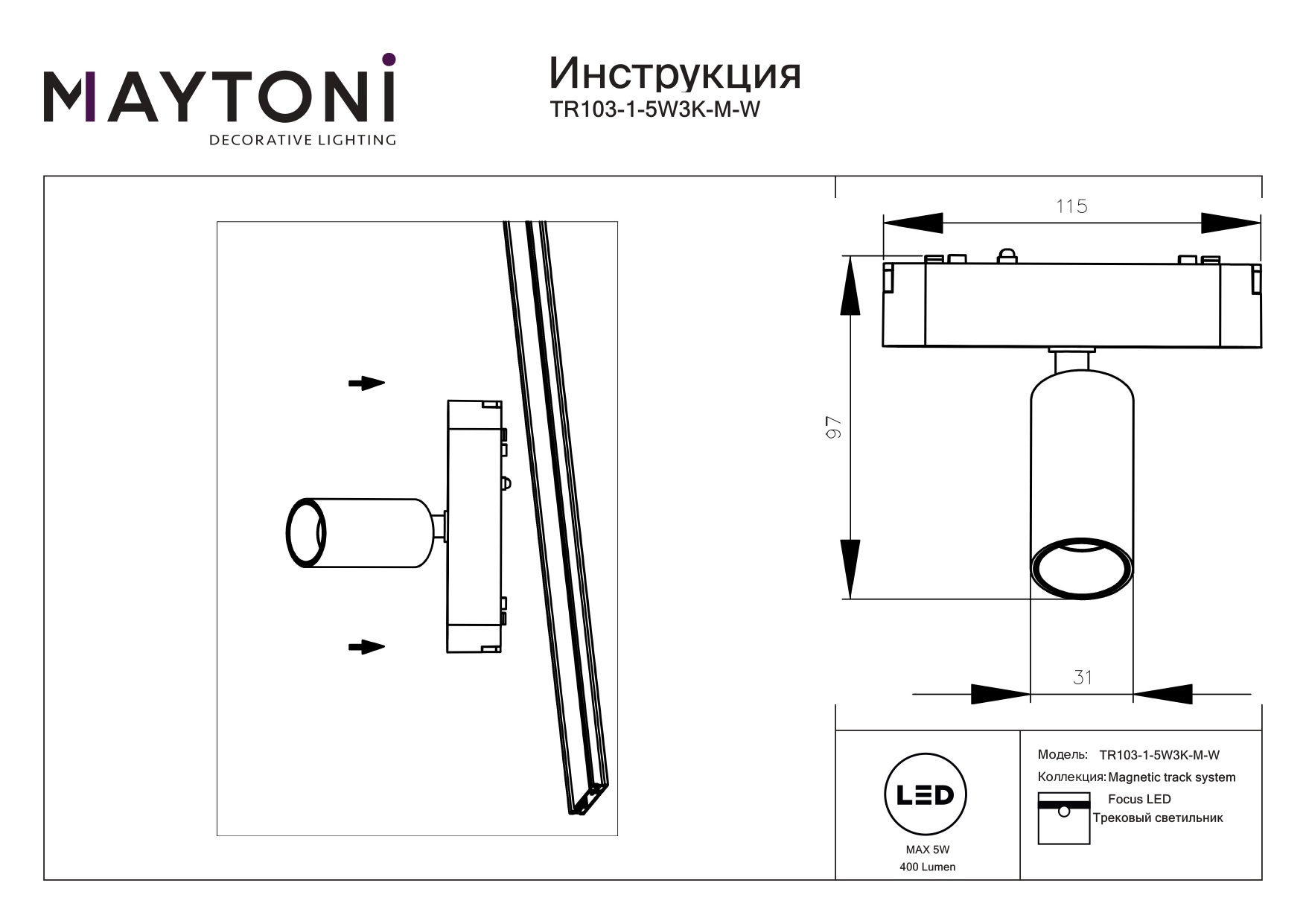 Трековый магнитный светодиодный светильник Maytoni Focus LED TR103-1-5W3K-M-W в Магнитогорске