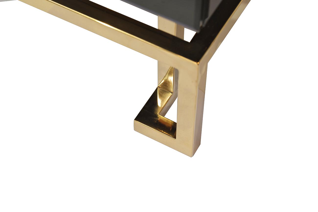 Представленная черная тумбочка станет гармоничным дополнением помещения в классическом стиле или стиле ар-деко, нео-классика. Черная тумбочка с ящиками идет на золотых металлических ножках оригинальной формы, из аналогичного ножкам материала выполнена фурнитура – ручки на 2х ящиках. Особую прелесть модели придают панели из черного стекла, из-за чего она выглядит очень роскошно. Дизайнерскую прикроватную тумбочку можно устанавливать у кровати в спальне, возле массивного стола в рабочем кабинете, у дивана в гостиной. Тумба прекрасно сочетается с комодом арт. KFG057, консолью арт. KFG058 и зеркалами арт. KFG047, арт. KFE1270