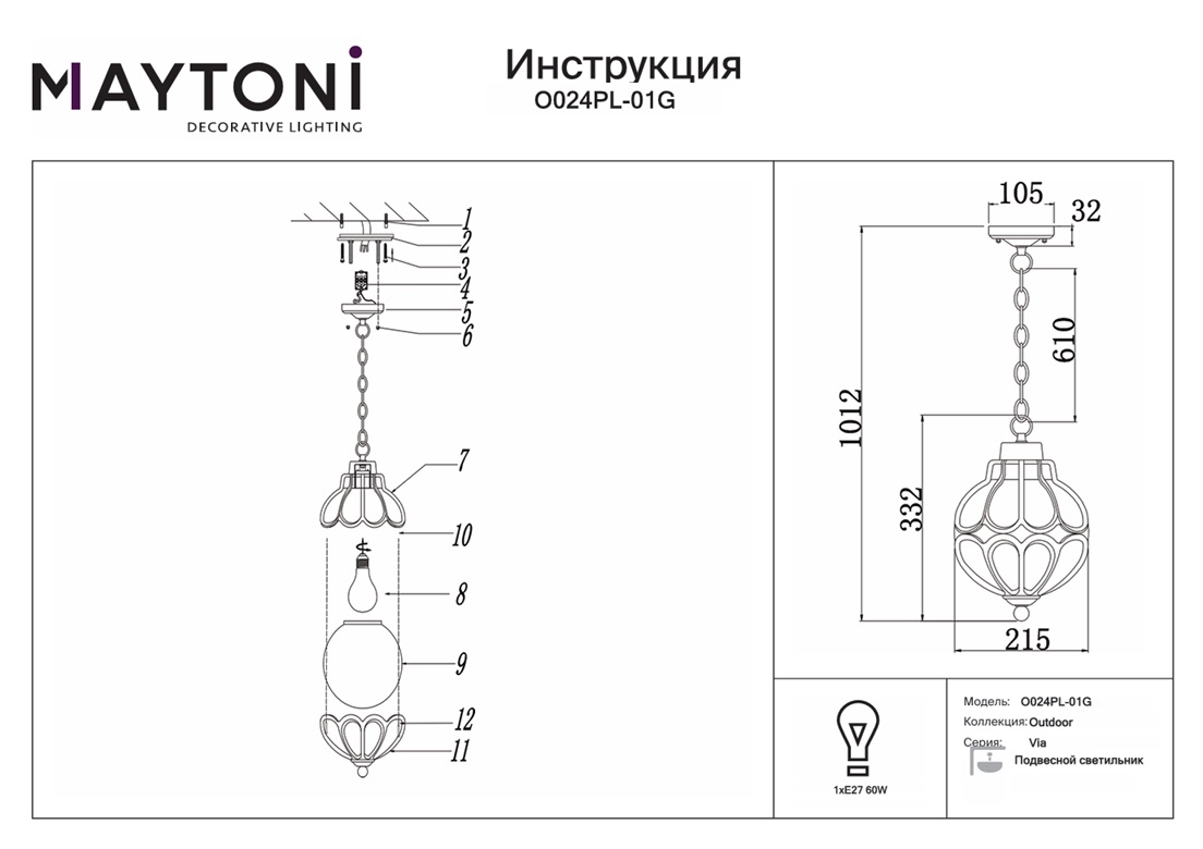 Уличный подвесной светильник Maytoni Via O024PL-01G — это надёжный и долговечный осветительный прибор, который прослужит вам долгие годы, не теряя своей яркости и качества света.